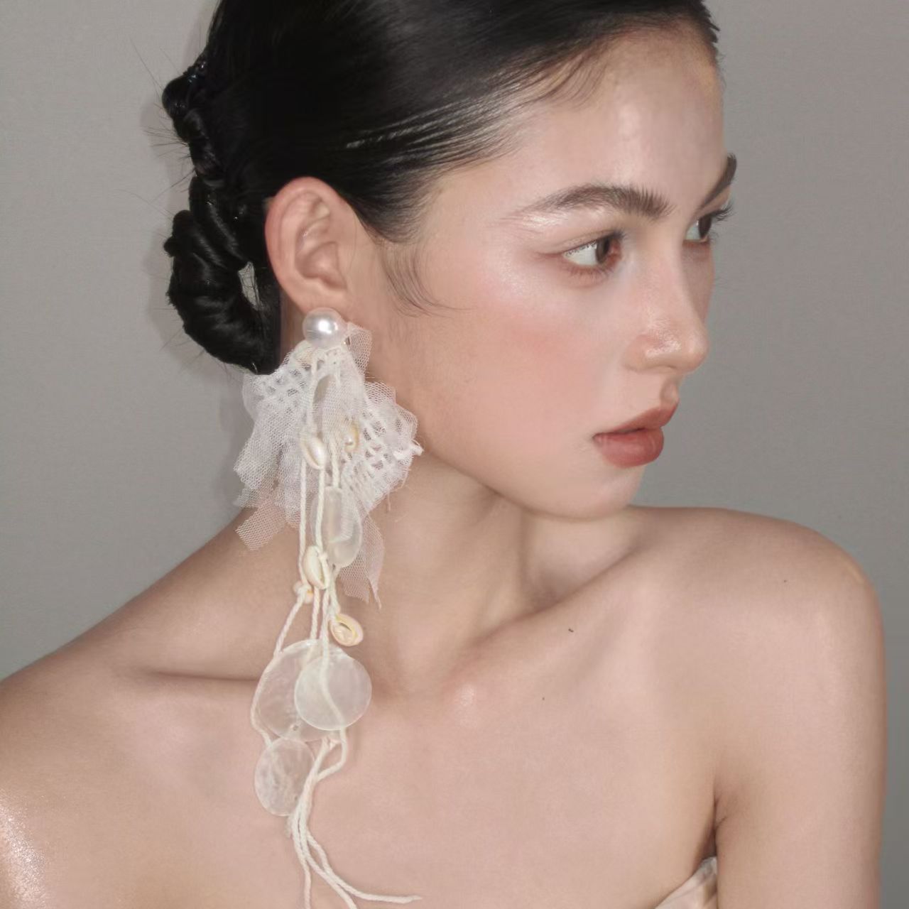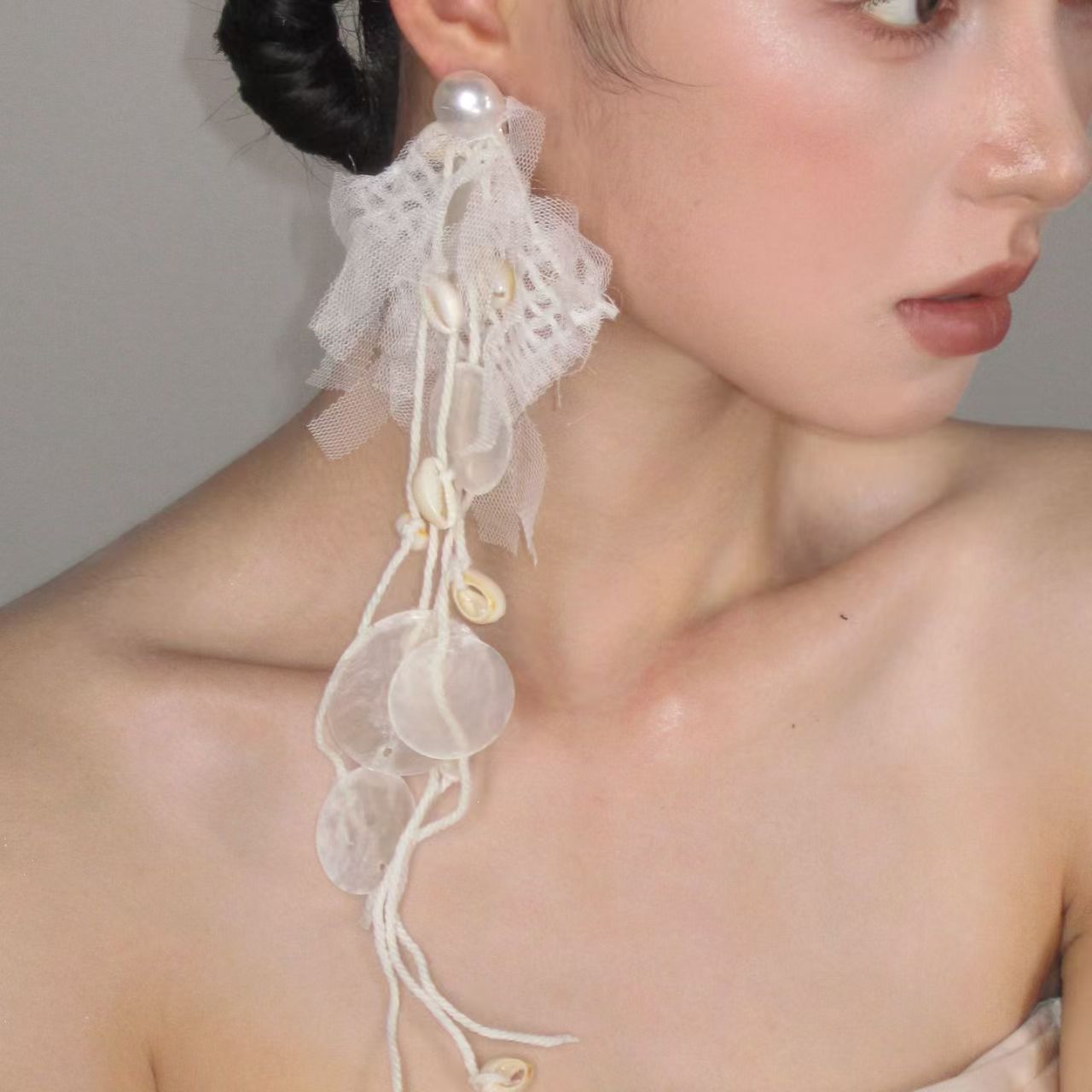 贝曳风吟~超仙感白色仿贝壳串珠耳环长款小众新娘婚纱耳饰女法式