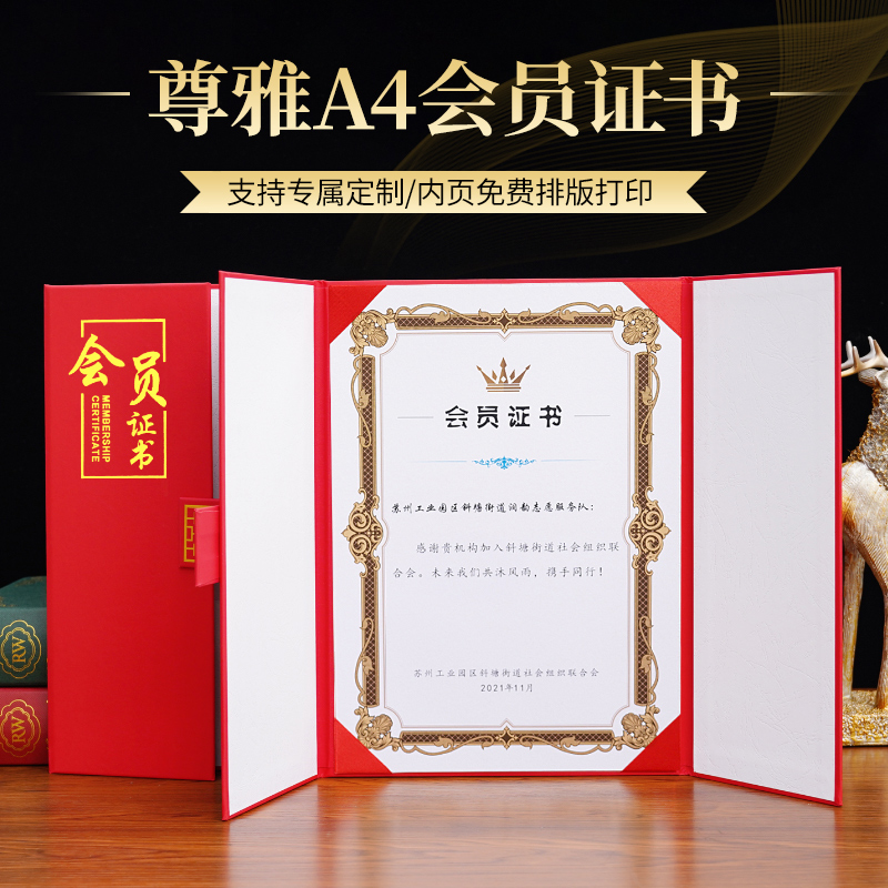会员证书外壳A4专属证书可烫金定制企业门店培训机构logo定做颁发颁奖荣誉证书三折封套打印制作内芯内页