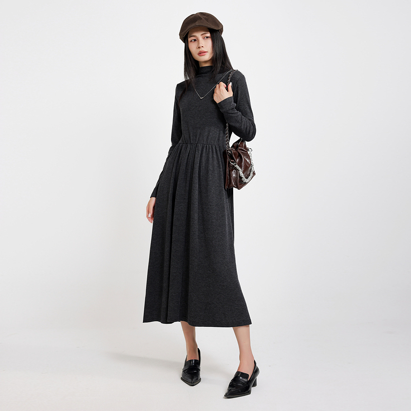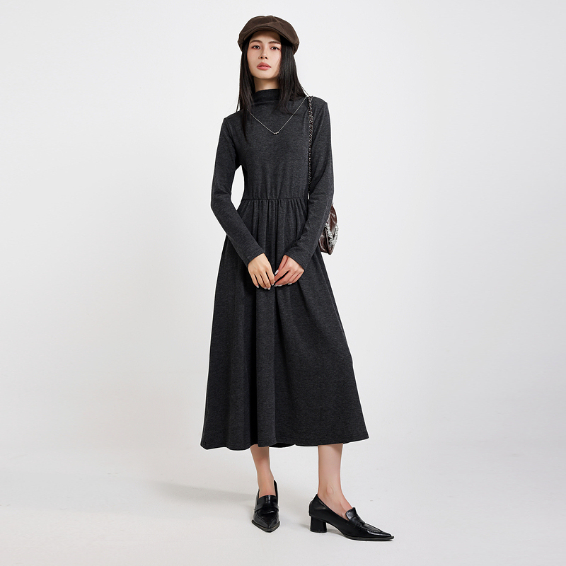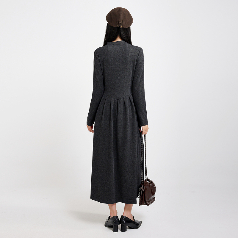 记忆的起点长袖连衣裙女2024年秋冬新款圆领灰色长裙子68GD8001D