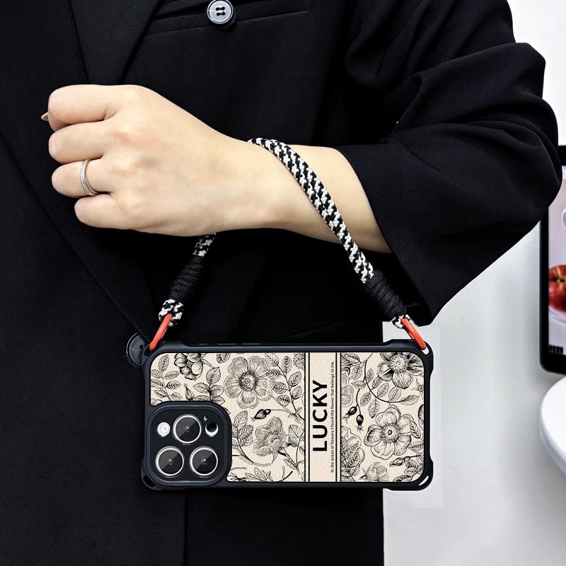 线条花朵适用苹果16promax手机壳四角防摔iPhone15por保护套小羊皮14por斜跨长短挂绳13pm小众复古12女款11潮