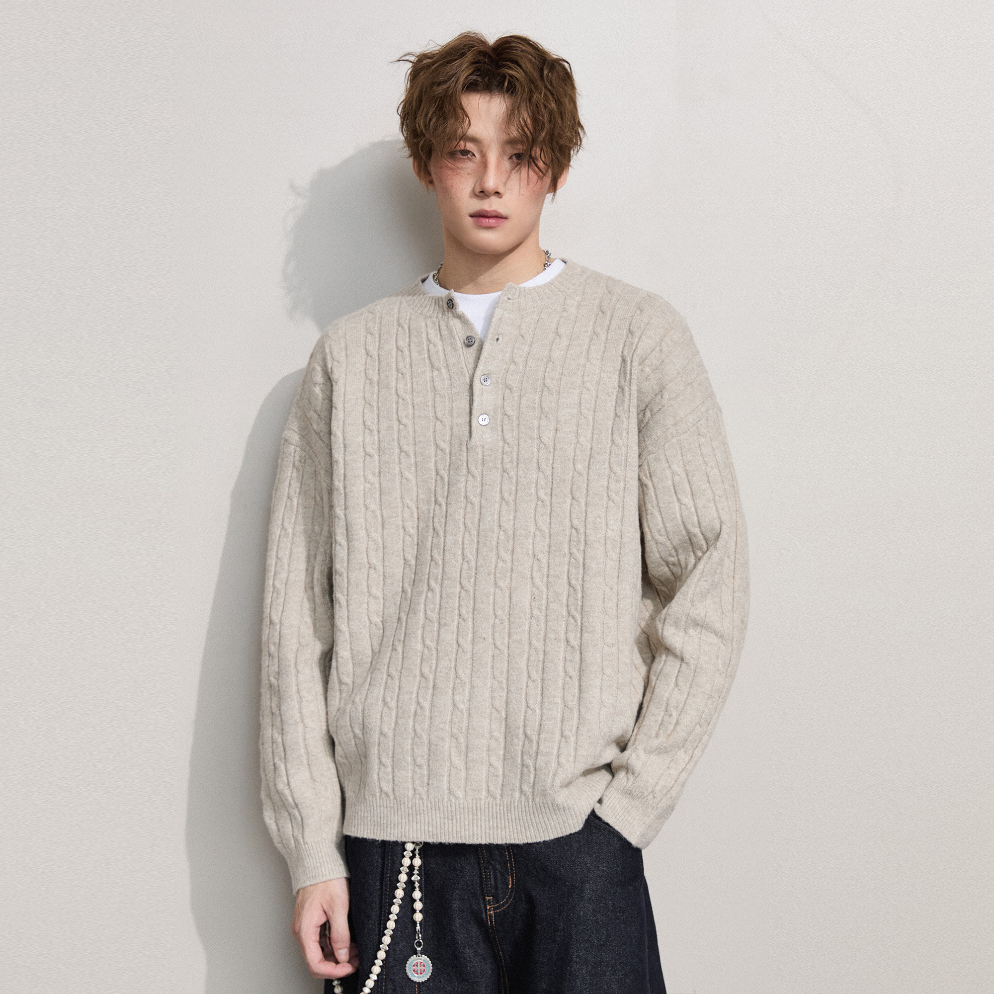 ALLIN 美式亨利领毛衣男秋冬季麻花纹含羊毛半开襟纽扣打底针织衫