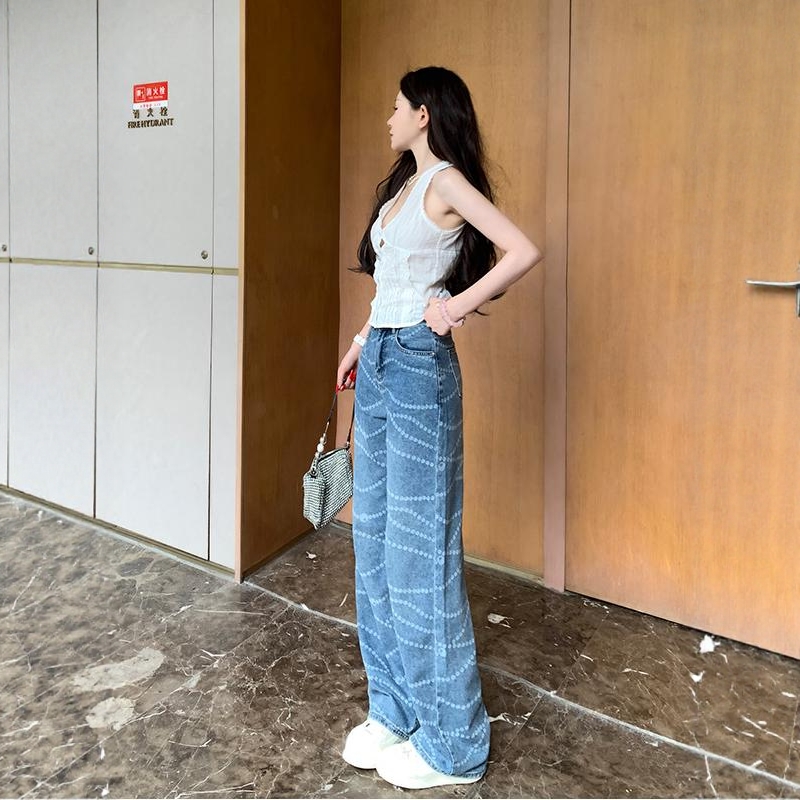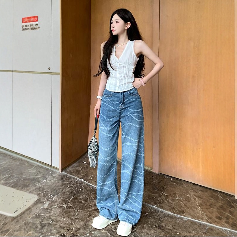 李李服饰小香珍珠链条印花阔腿牛仔裤女2025秋季新款高腰宽松长裤
