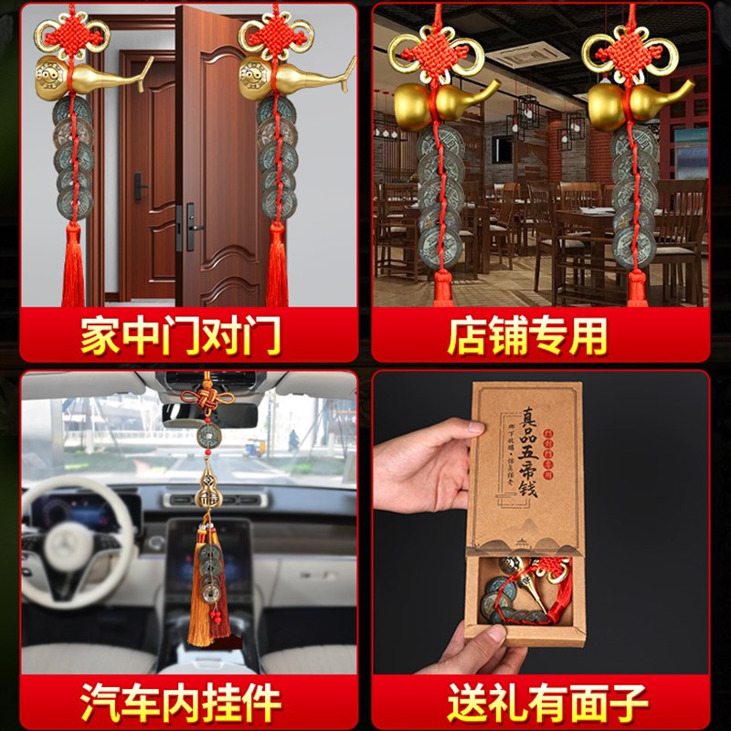 真品五帝钱门对门葫芦挂件纯铜入户门吉祥结铜钱串招财古币五吊钱