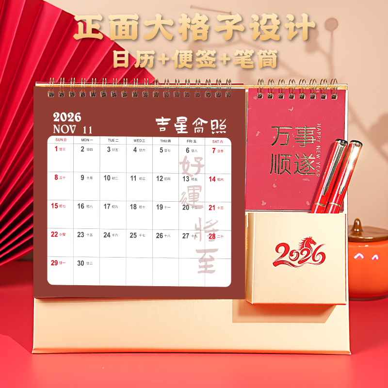 得将 2026年喜庆台历马年新款多功能桌面摆件月历自律打卡计划日历送礼自用收纳红色中国风可定制logo
