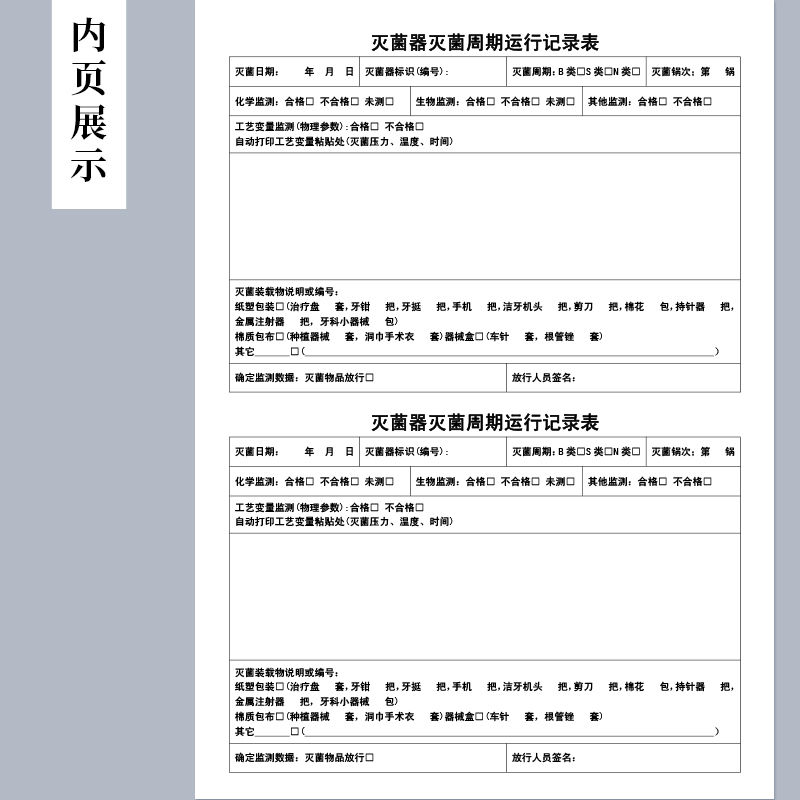 灭菌运行检查记录灭菌器灭菌周期运行登记本口腔医院医疗器具灭菌周期运行检查登记本口腔诊所器械灭菌记录本