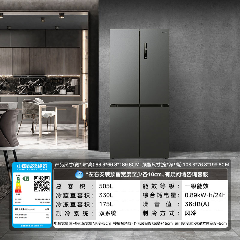 美的508法式双系统多门净味四门双循环无霜一级大容量家用冰箱