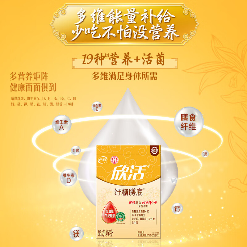 伊利欣活纾糖膳底奶粉高钙低GI食品成人中老年营养品同仁堂联名