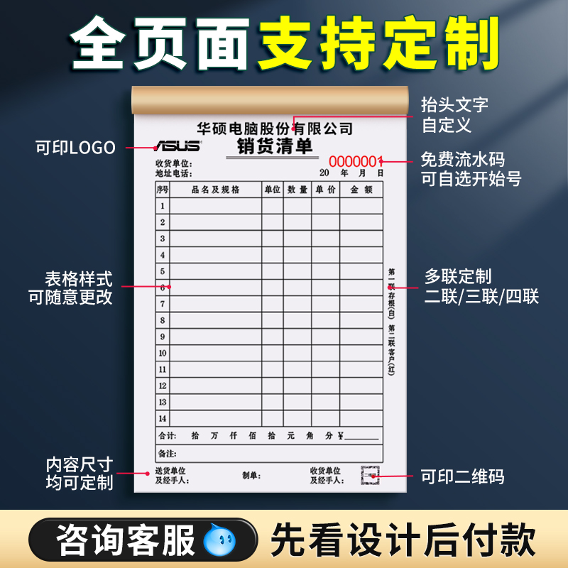 销货清单定制二联单送货单销货清单三联带复写销售单手写送货本单据定做两联印刷本订制发货清单单联合同加厚