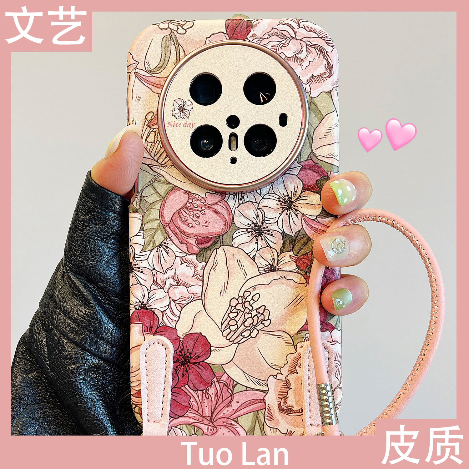 拓岚 适用华为pura80pro+新款手机壳Pura70ultra秋冬p60复古文艺油画粉色花朵mate70/60/50皮质40pro腕带挂绳