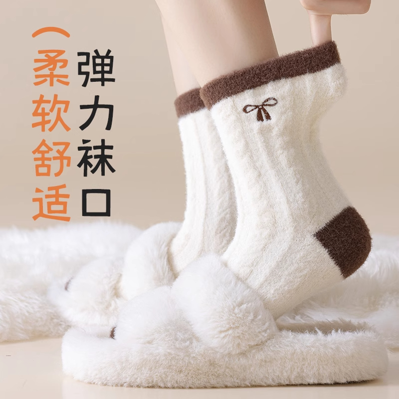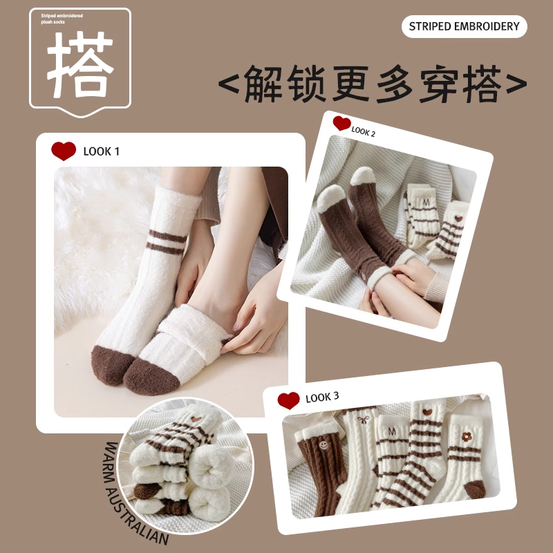 澳绒袜子女中筒袜秋冬加厚保暖加绒长袜居家睡眠月子袜条纹地板袜