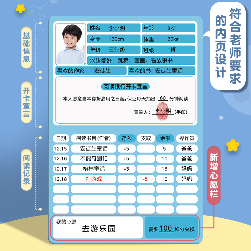 阅读记录卡读书卡小学生阅读登记册打卡本一年级二年级三年级语文读书记录卡儿童每日计划手册阅读记录本自律