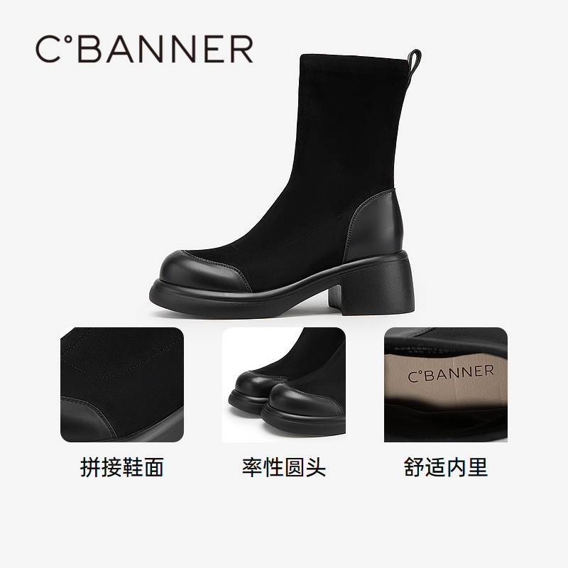 千百度拼接厚底弹力靴袜靴女2024冬季新款增高粗跟瘦瘦靴短靴子