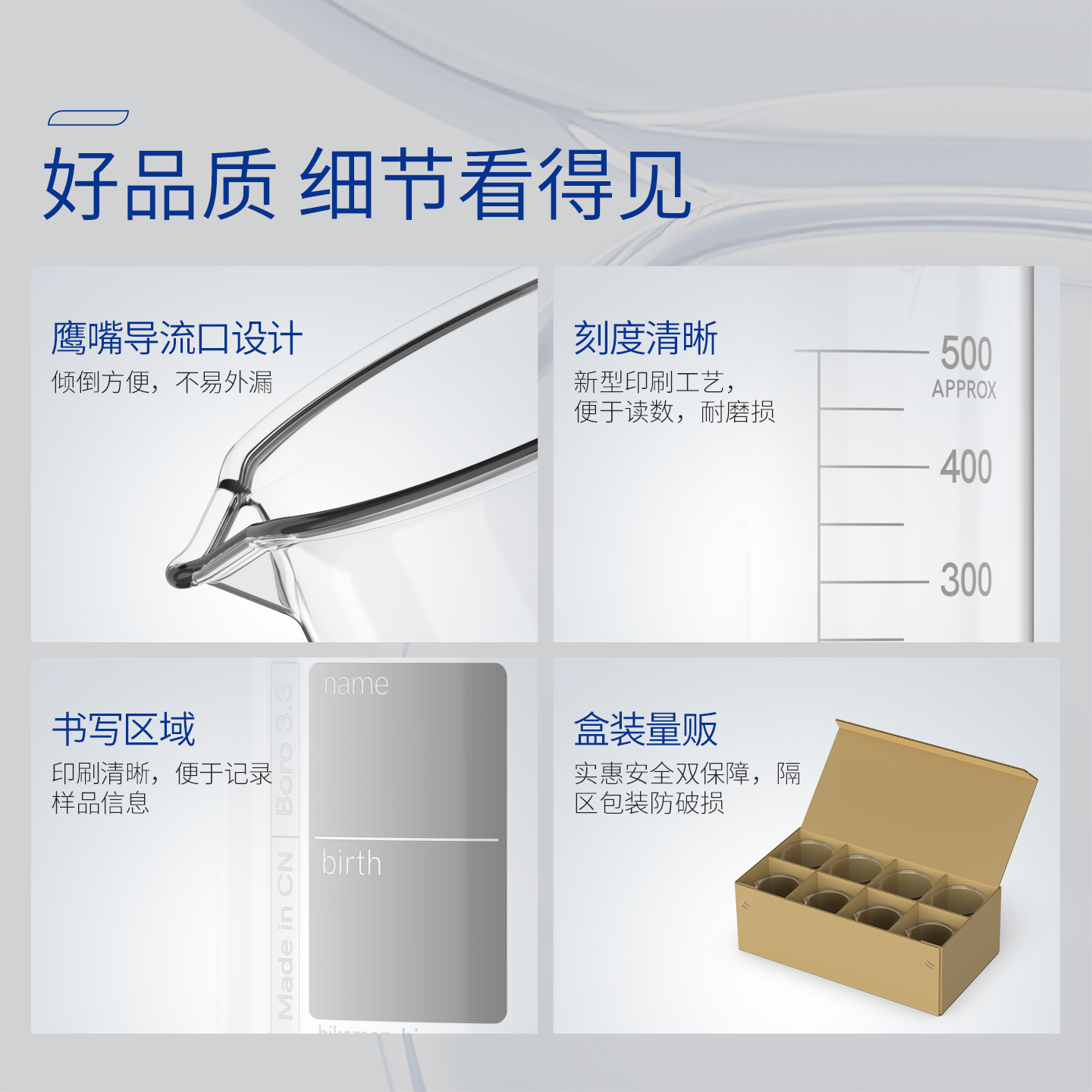 湘玻玻璃烧杯肖特加厚高硼硅带刻度烧杯整盒耐高温化学实验室烧杯透明加热玻璃量杯250毫升5 600/1000/2000ml