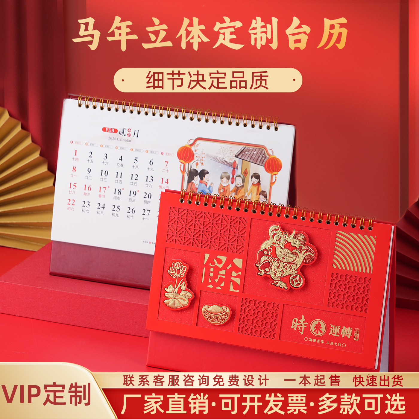 2026年台历日历新款2026台历定制广告烫金印字专版马年中国红大号精雕立体台历企业单位定制挂历日历韩版记事