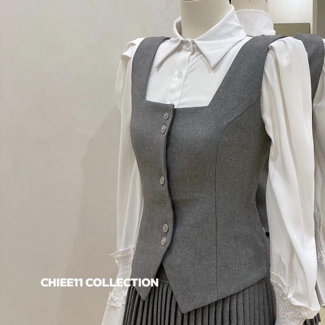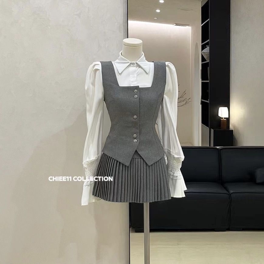 法式小众甜酷西装马甲长袖衬衫短裙女秋季大码时尚三件套装潮开衫