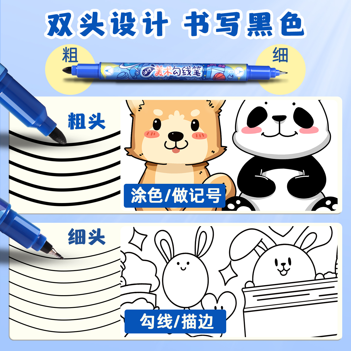 双头记号笔勾线笔美术专用小学生绘画黑色油性粗细两头儿童幼儿园马克笔描边速干防水防油不掉色工地划线