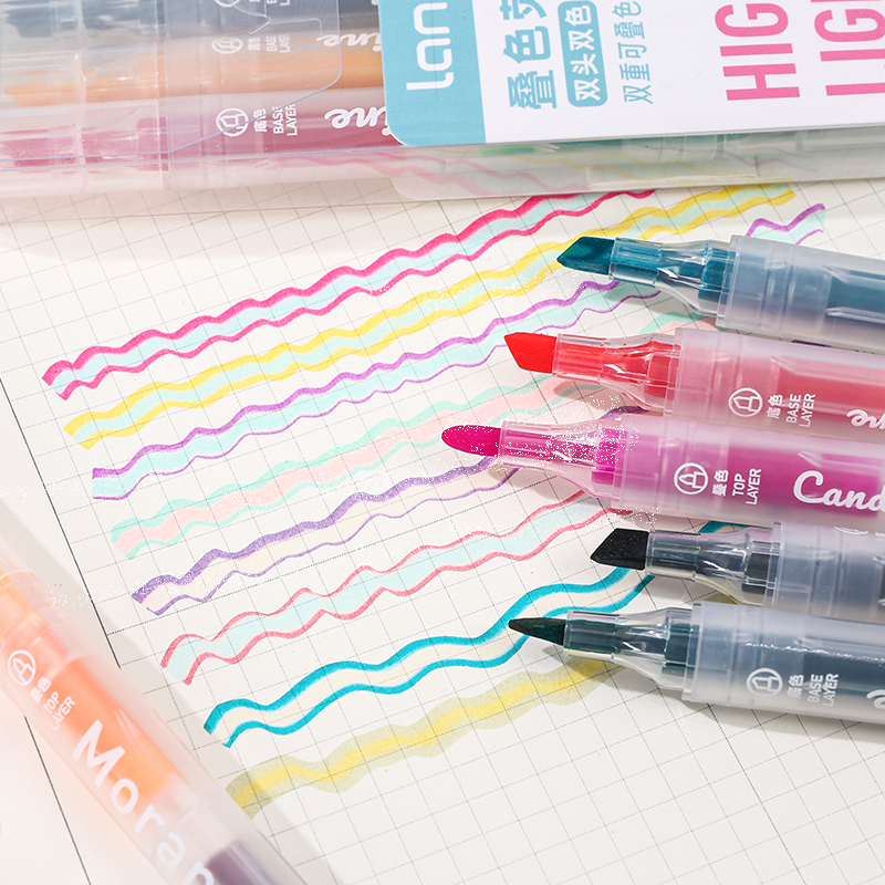 蓝果双头叠色荧光笔重点标记更清晰高颜值ins风学生学习专用手账文具记号做笔记彩色柔色护眼笔杆上自带亮闪