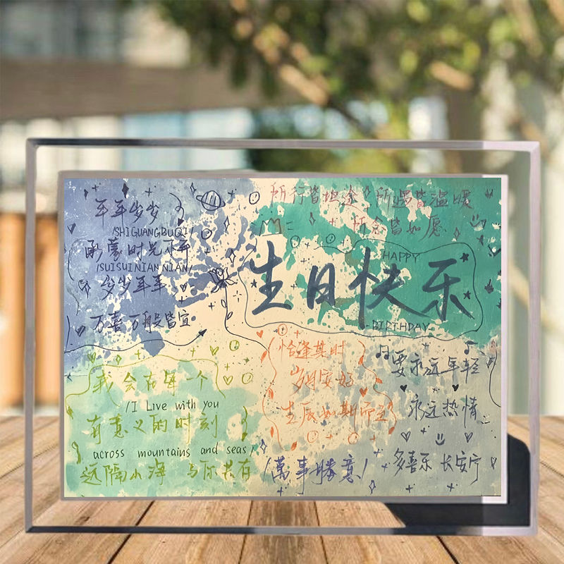 生日快乐贺卡手写彩绘生日礼物女生小众摆件精致水晶玻璃相框摆台