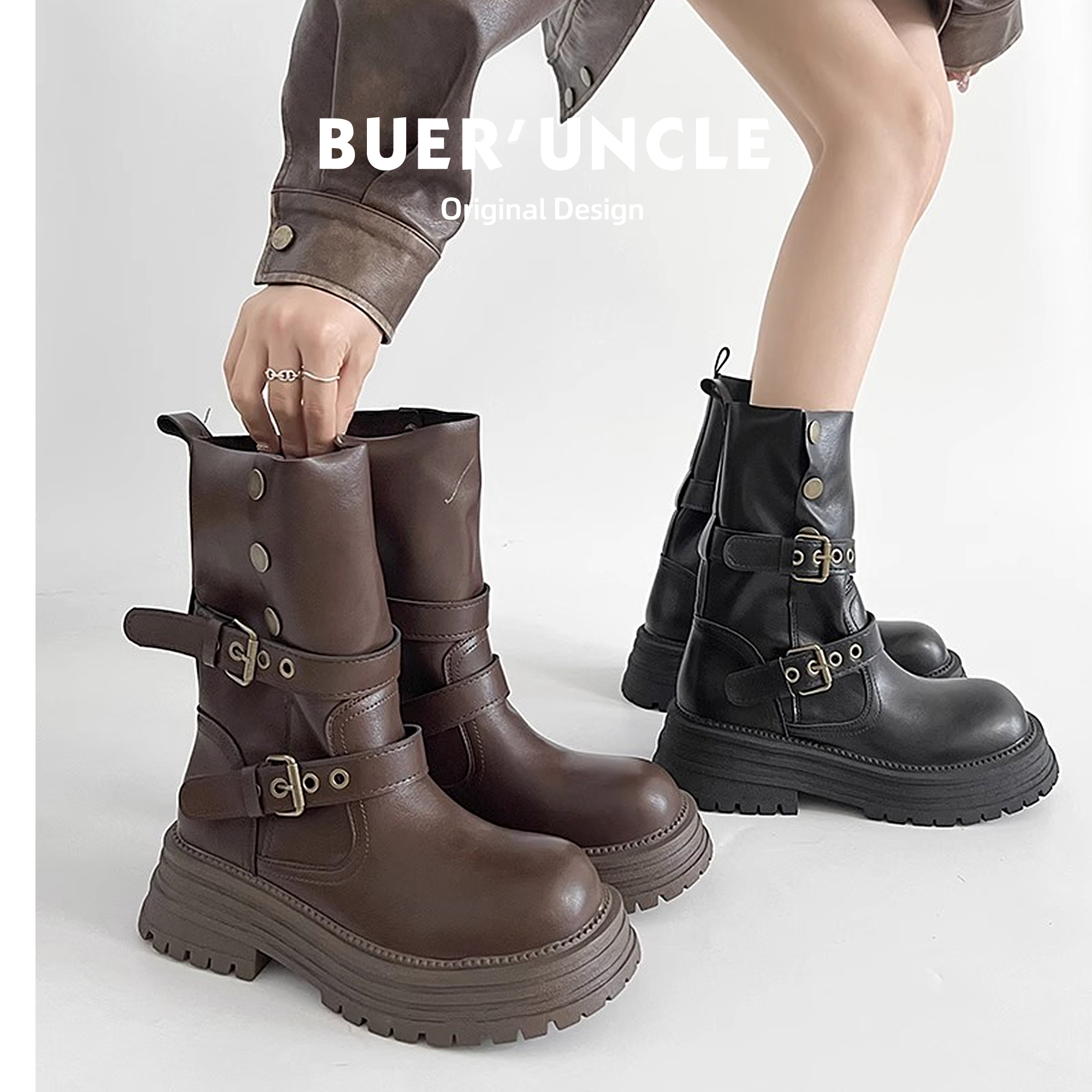 真皮~内增高复古机车马丁靴女秋金属扣擦色粗跟厚底西部堆堆短靴