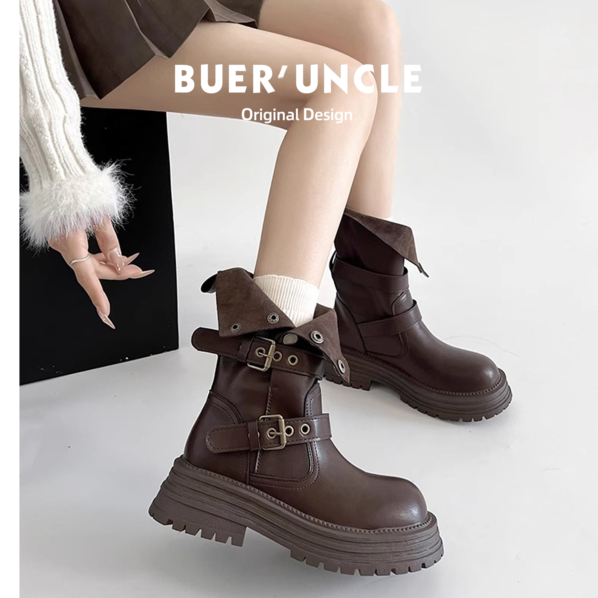 牛皮版~内增高棕色马丁靴女2025新款秋冬复古美拉德两穿厚底短靴