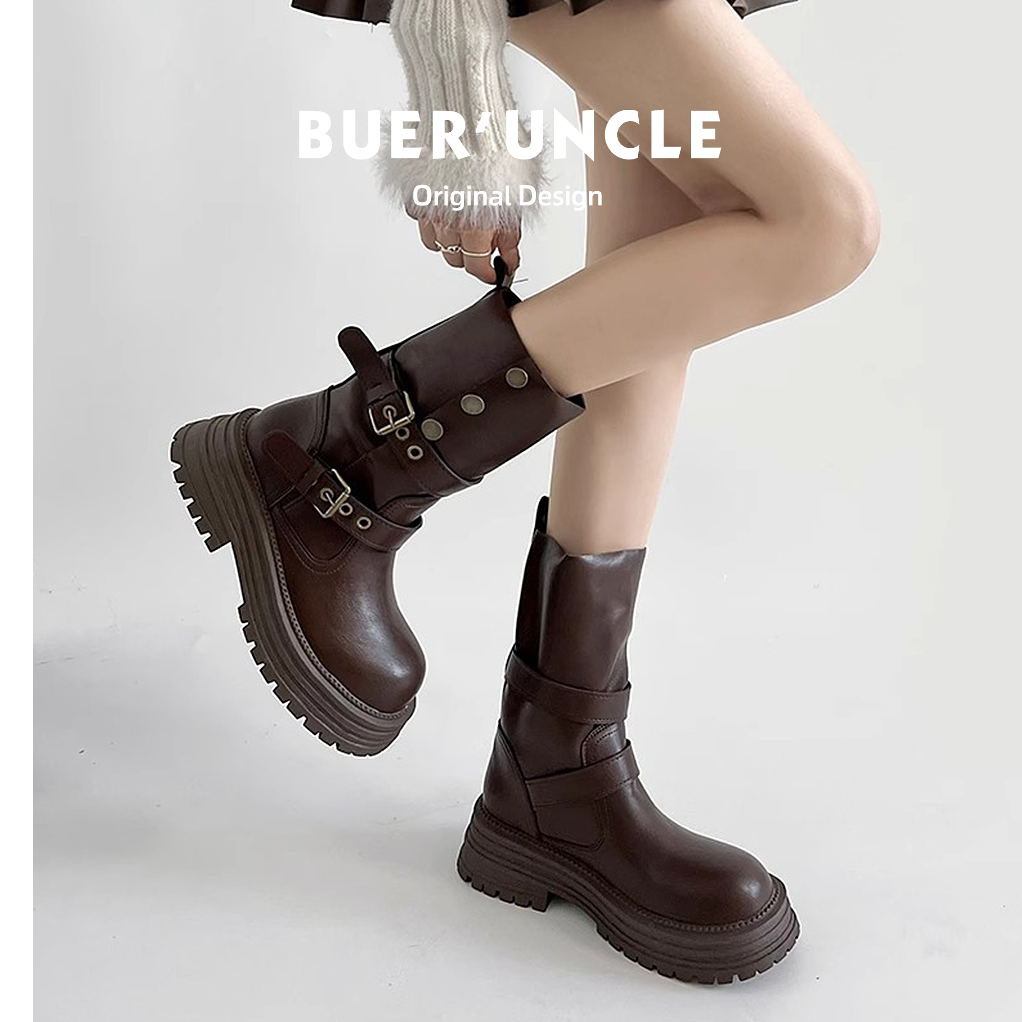 真皮~厚底内增高中筒短靴女2025新款两穿英伦风小个子棕色马丁靴