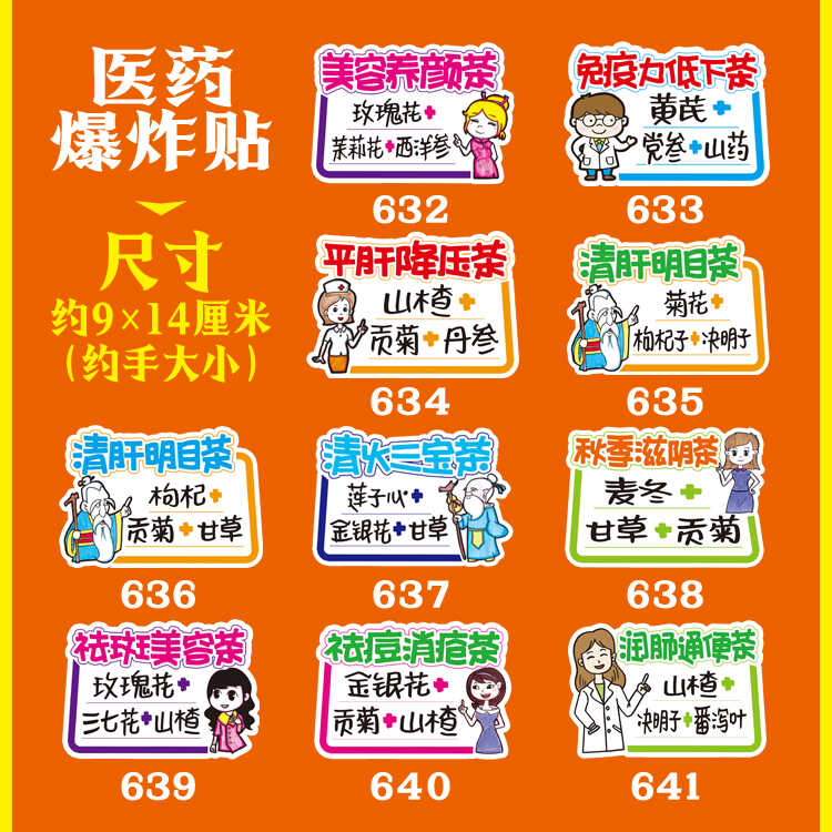 药房手绘风格花茶联合用药中药组方花茶养生爆炸签贴插卡小提示牌