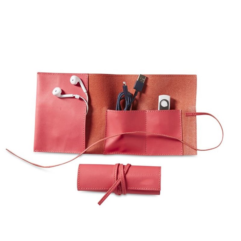批量头层牛皮卷帘耳机数据线收纳包 多功V能绑带收纳袋