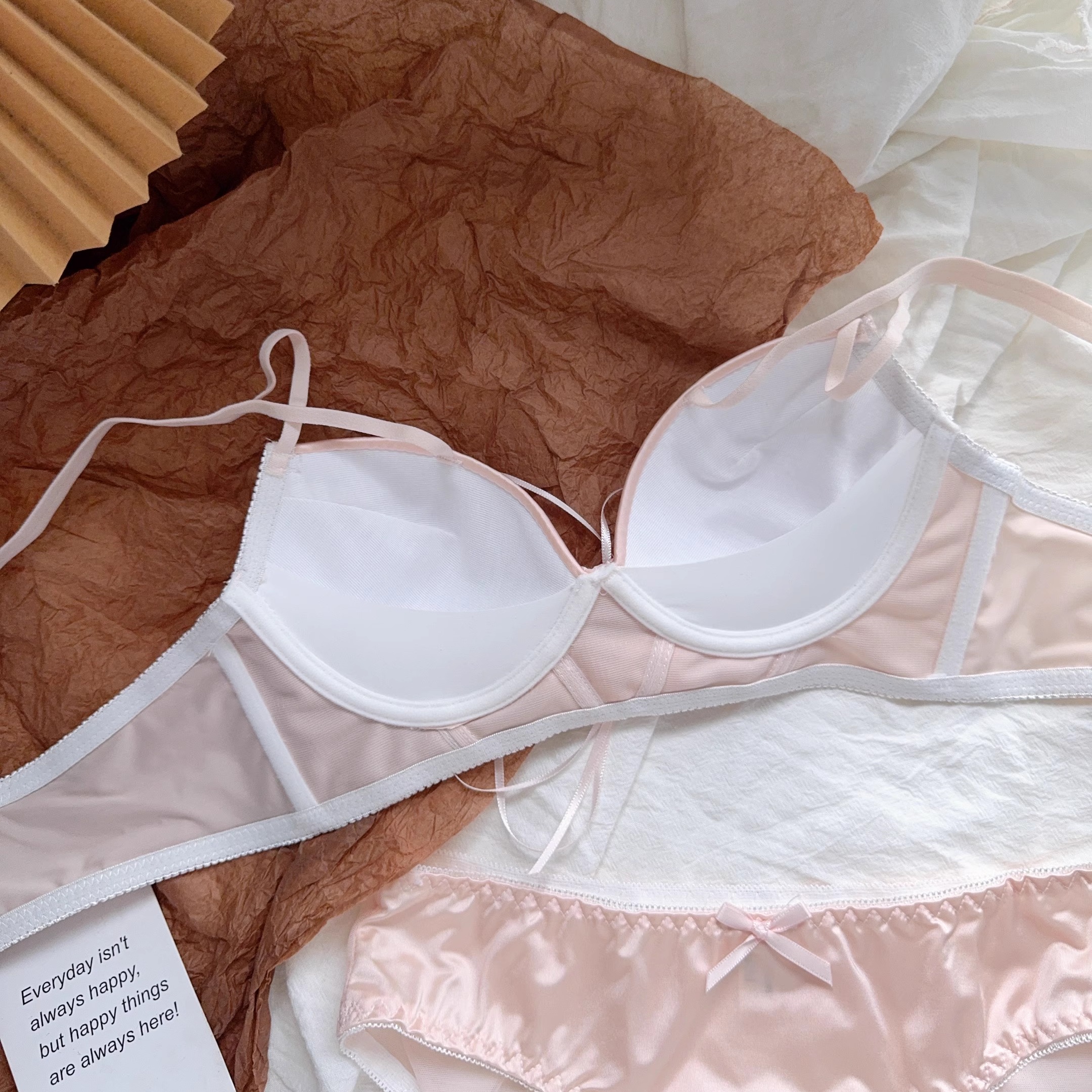 法式性感纯欲缎面内衣女小胸聚拢无钢圈绑带蝴蝶结蕾丝文胸罩套装