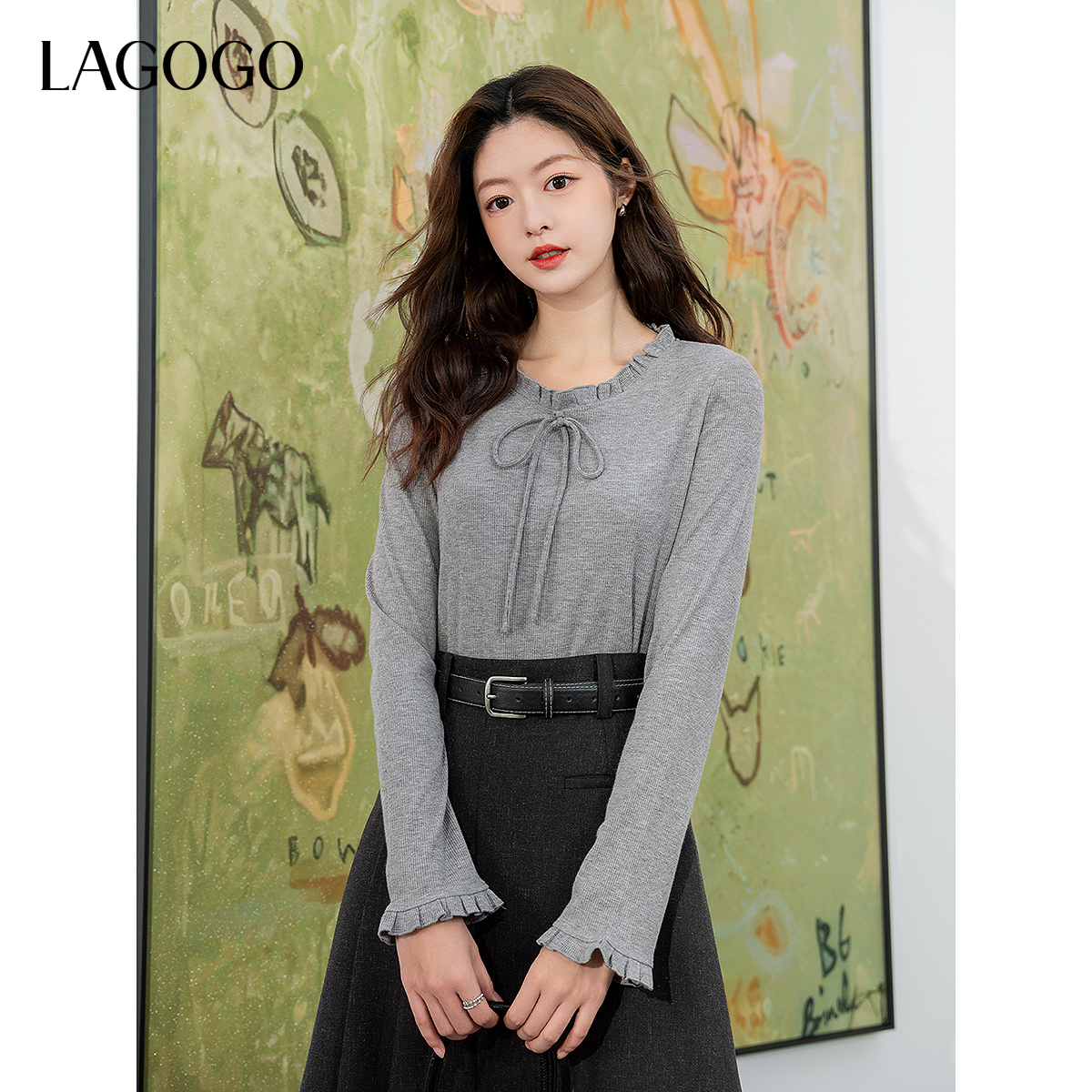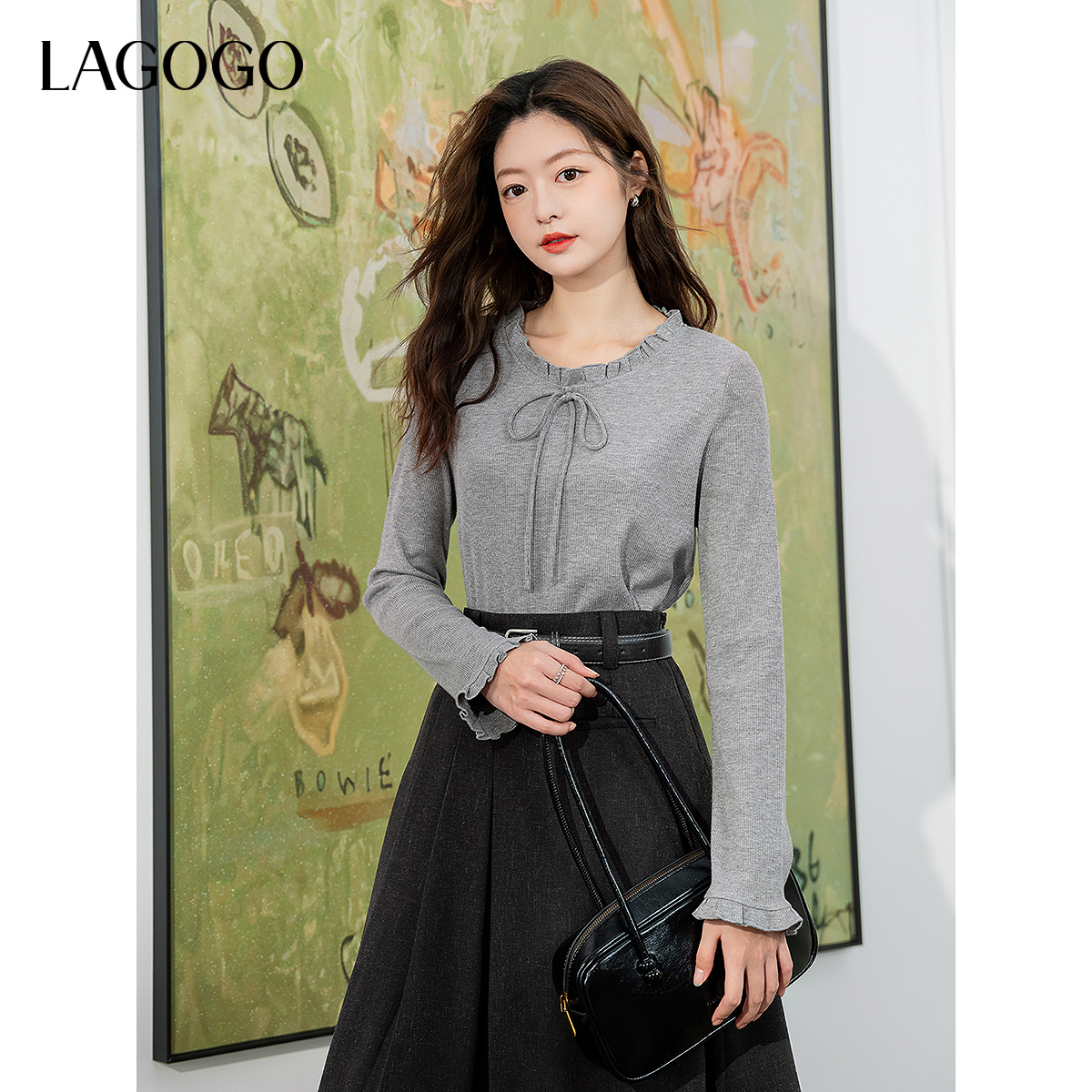 LAGOGO蝴蝶结miu系上衣女拉谷谷2025秋冬新款内搭长袖T恤打底衫