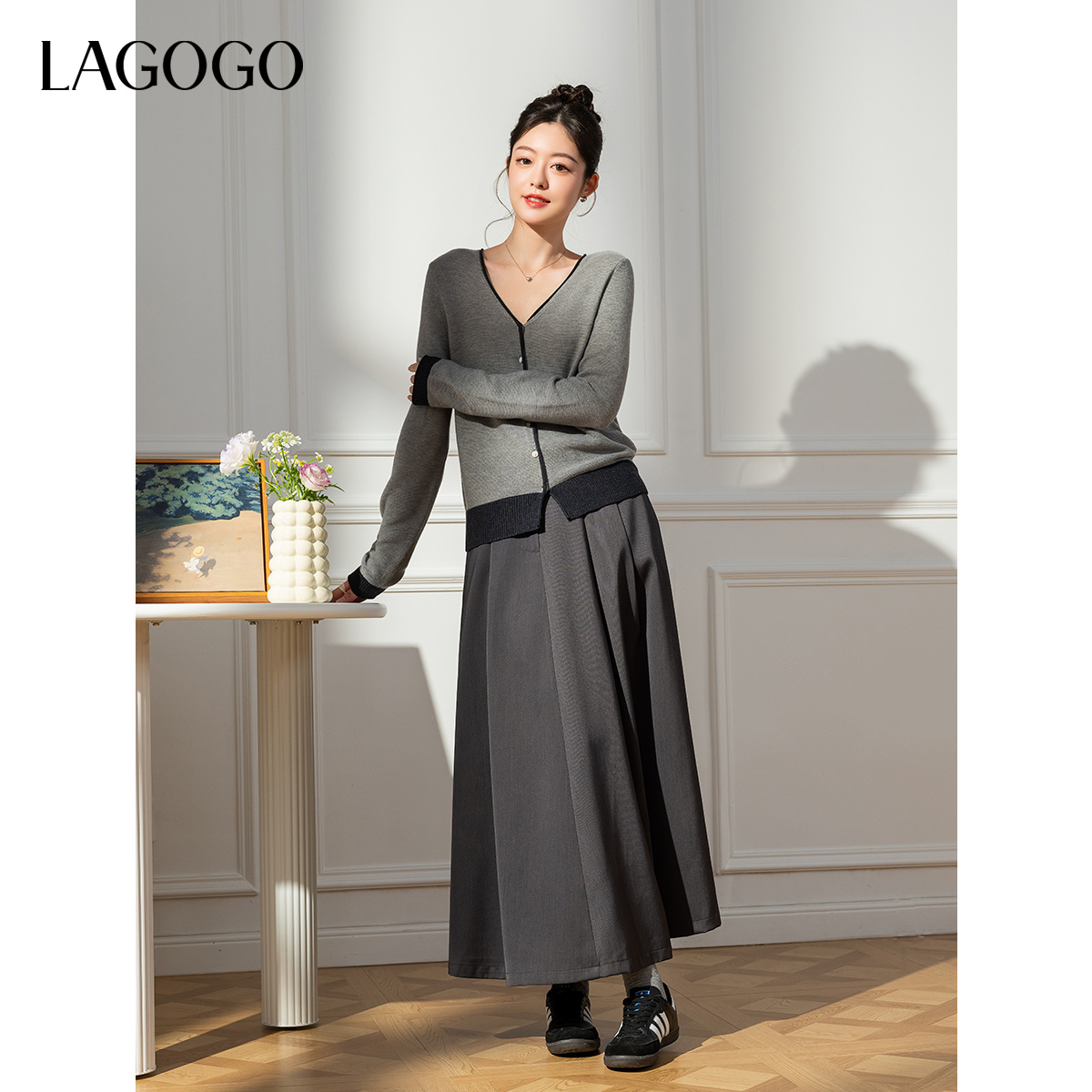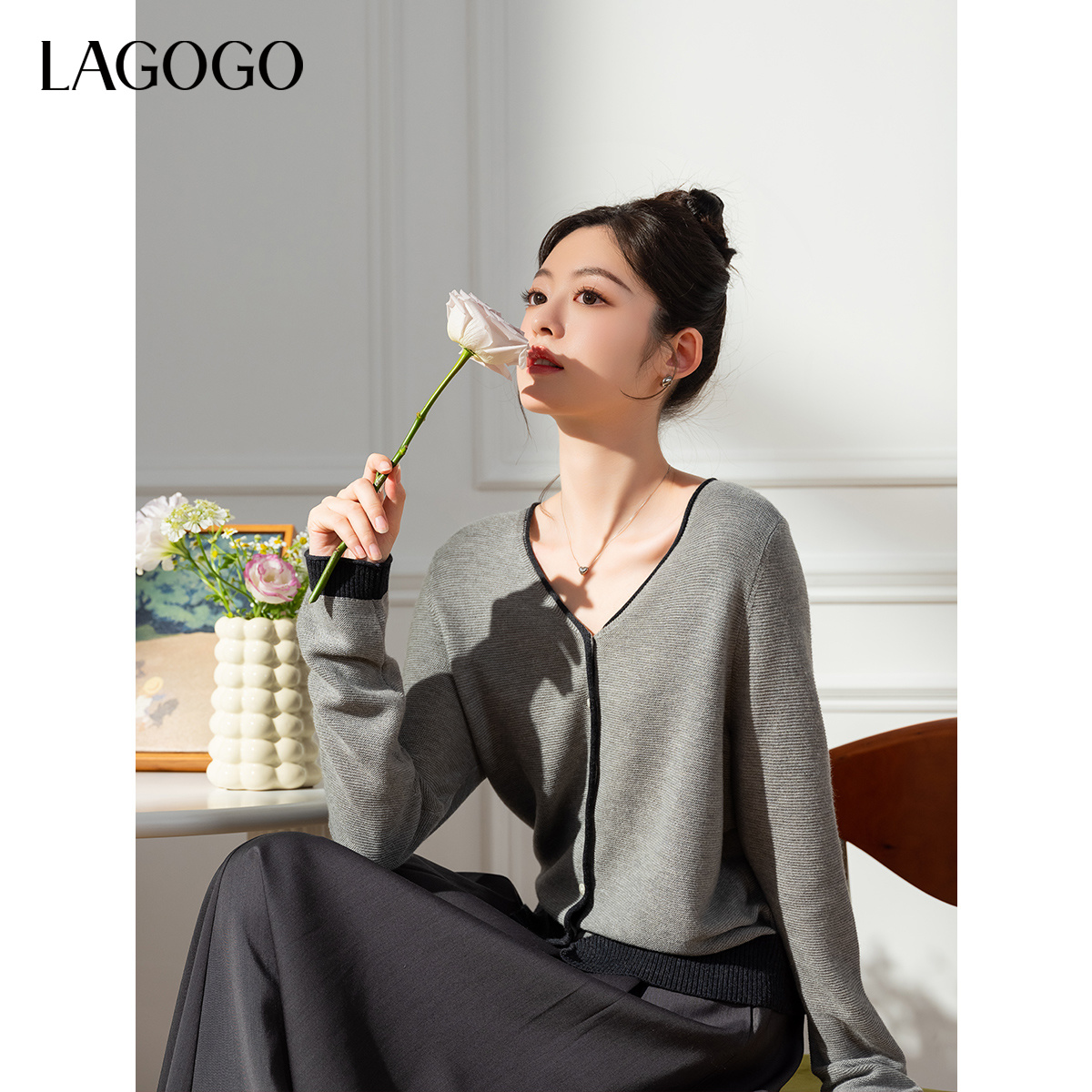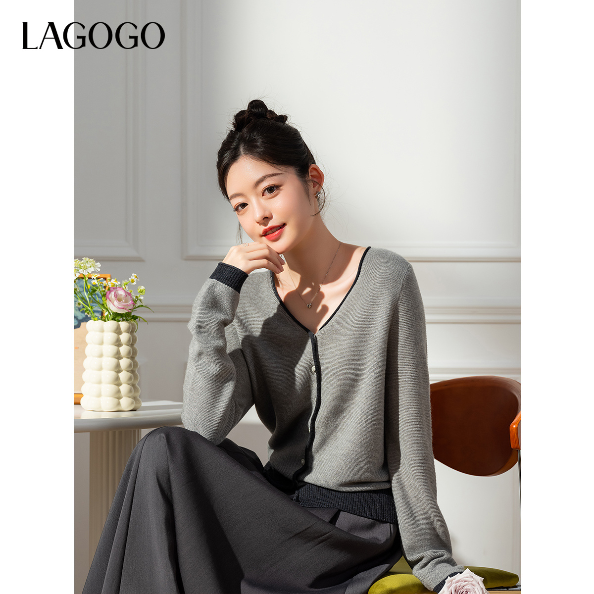 LAGOGO温柔云感v领针织开衫女拉谷谷2025春新款灰色简约气质上衣