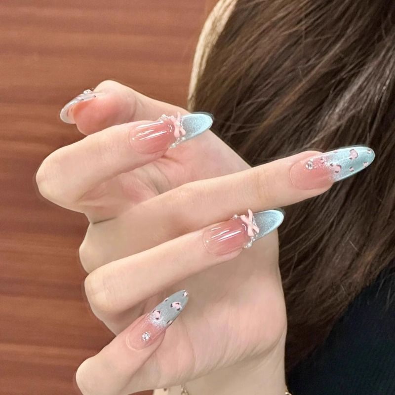 2025新款纯欲薄荷蓝豹纹手工穿戴甲法式猫眼显白可拆卸美甲贴片