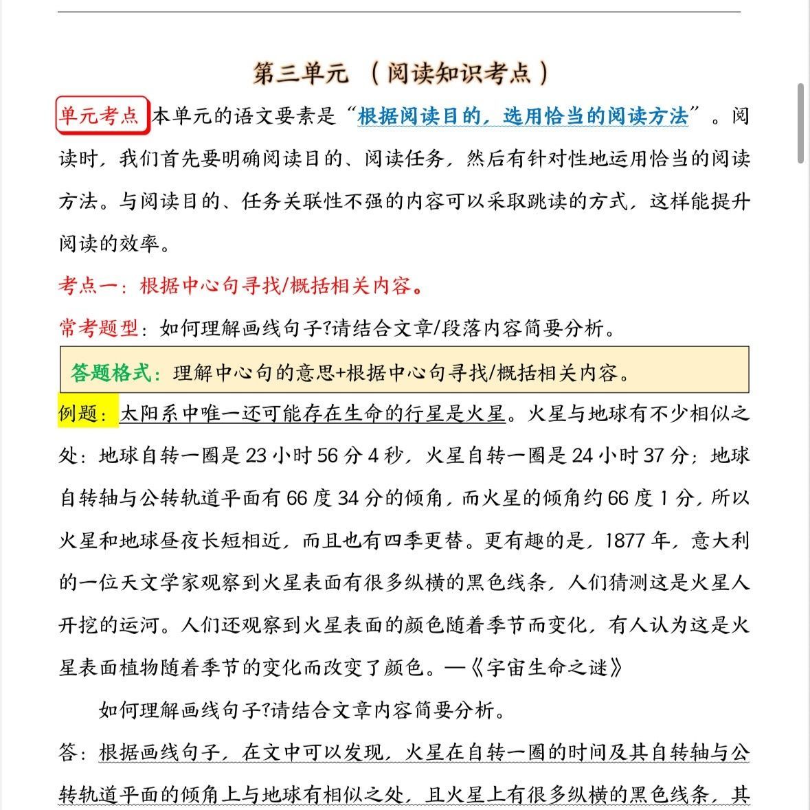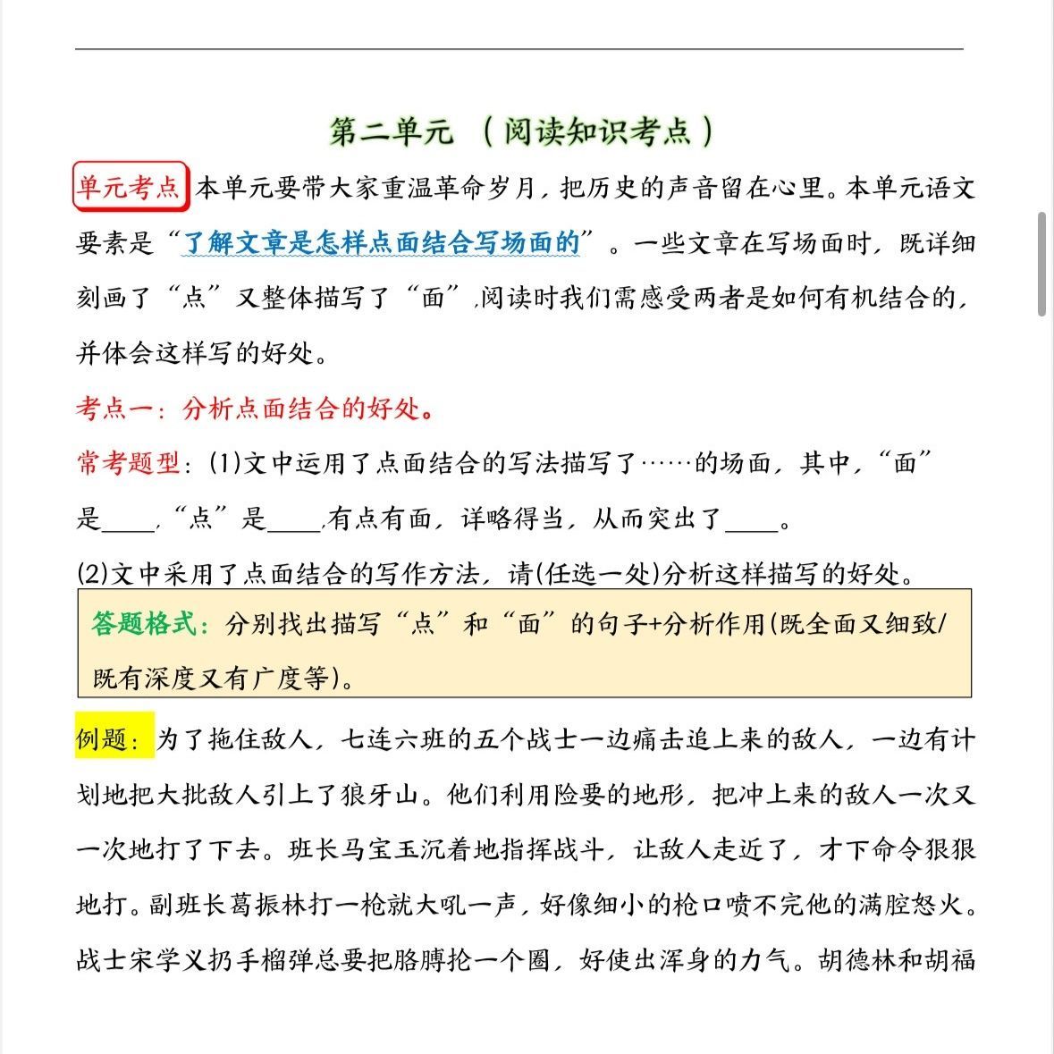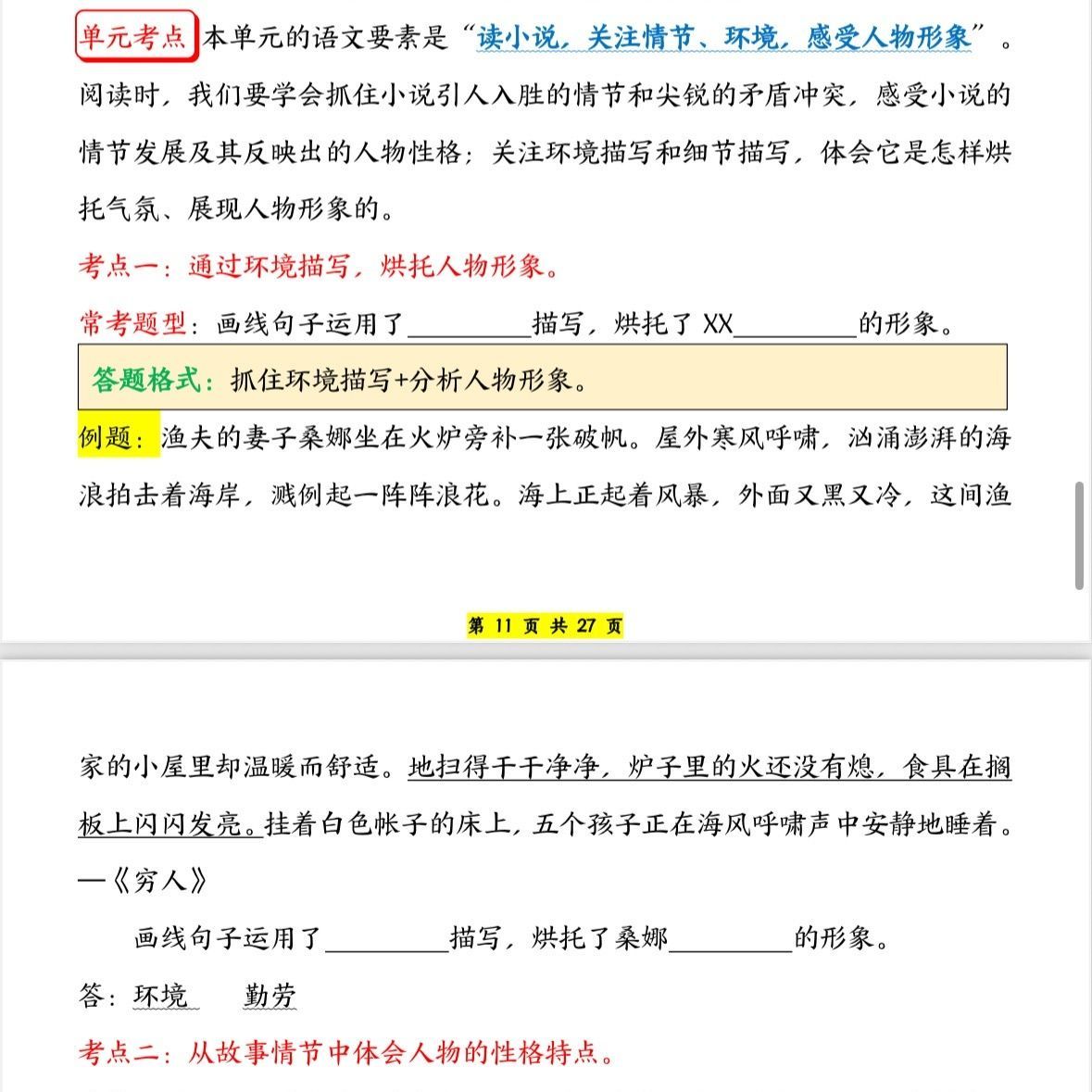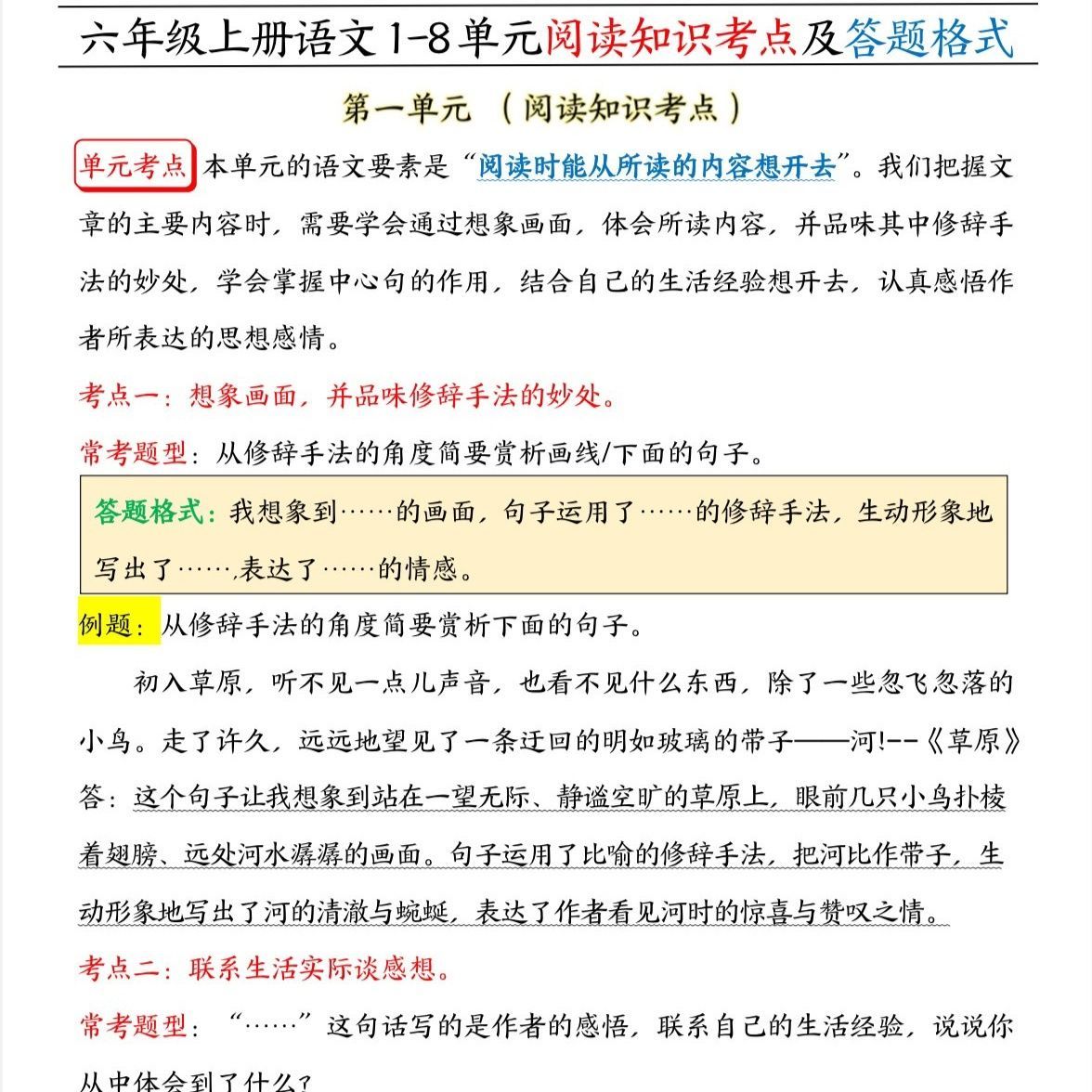 六年级上册语文阅读理解常考题型与答题公式1-8单元课本答案模板