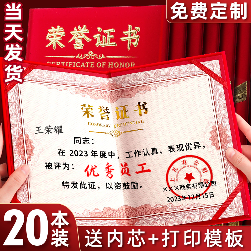 速发2024新款荣誉红绒面外壳制作内页内芯可打印封面员工颁奖状结