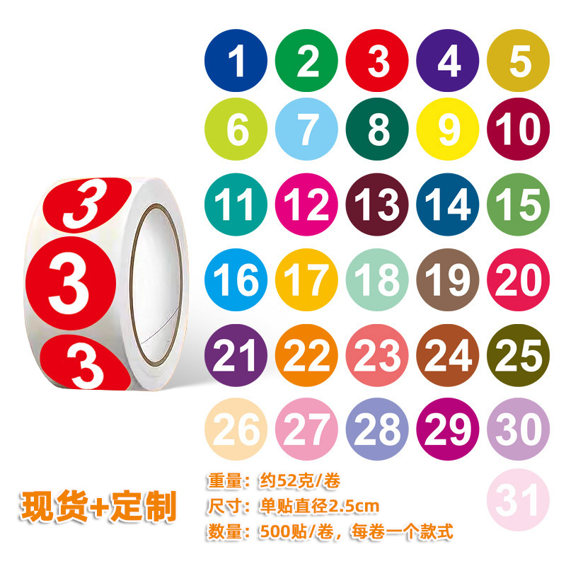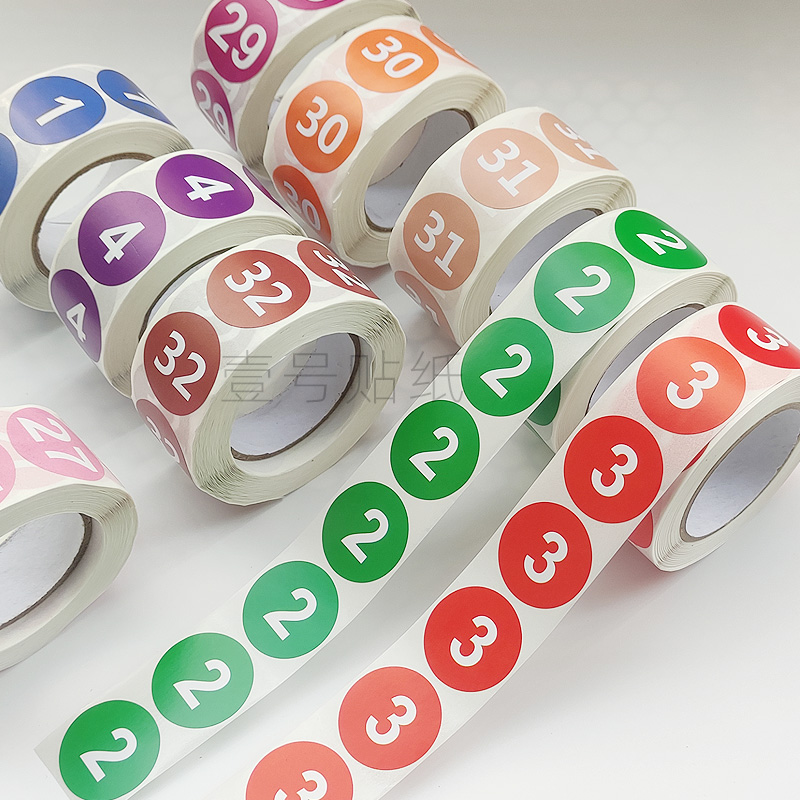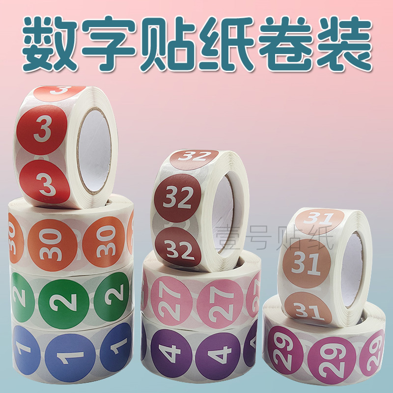 卷装数字编号贴纸1到33序列圆形自粘不干胶号码分类标签贴2.5cm