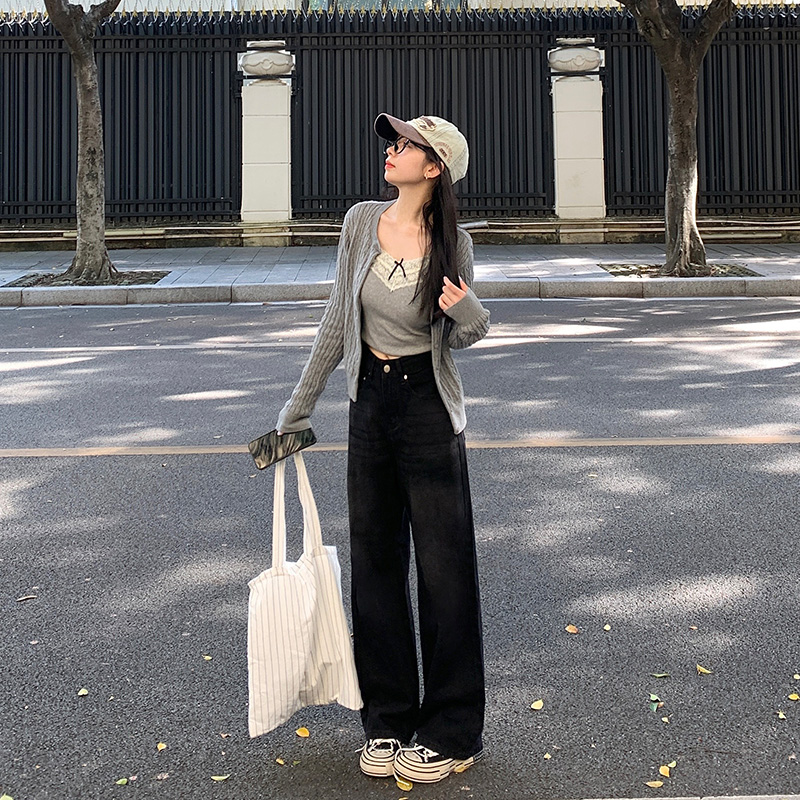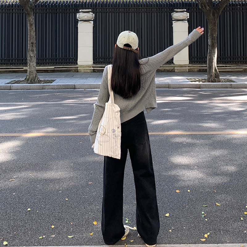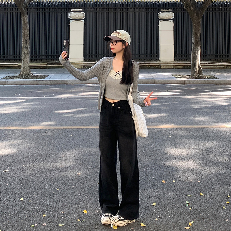 艾恩晟 黑灰色阔腿高腰黑灰色阔腿牛仔裤女宽松显瘦美式复古