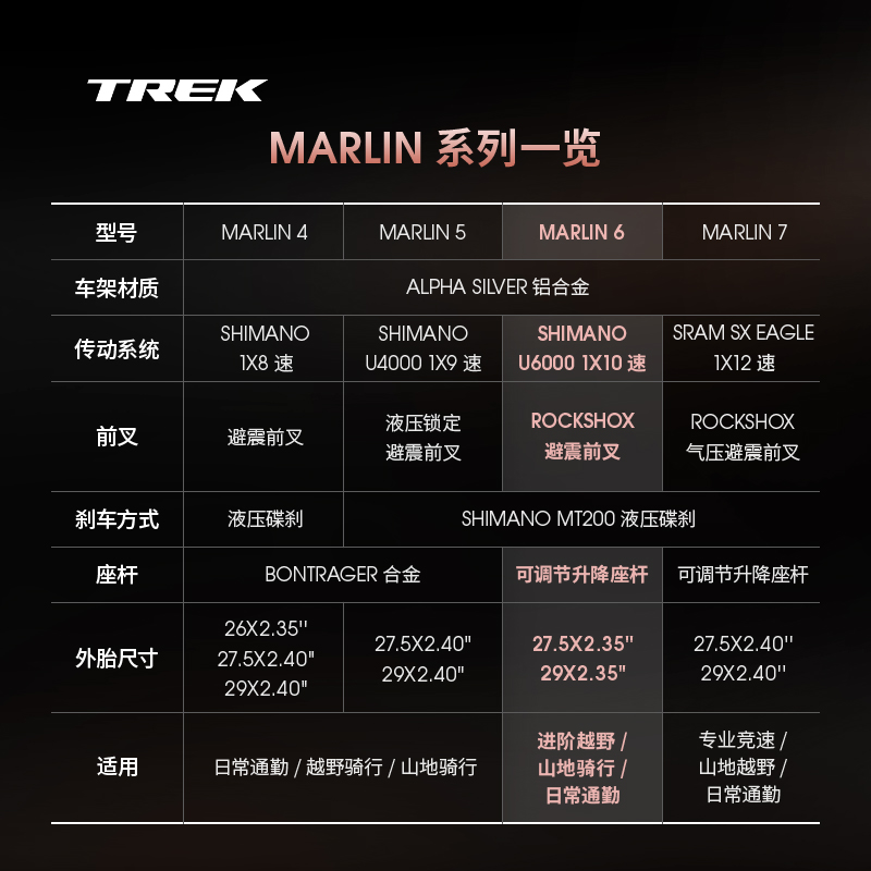 TREK崔克MARLIN 6轻量油压碟刹避震10速硬尾越野变速山地自行车