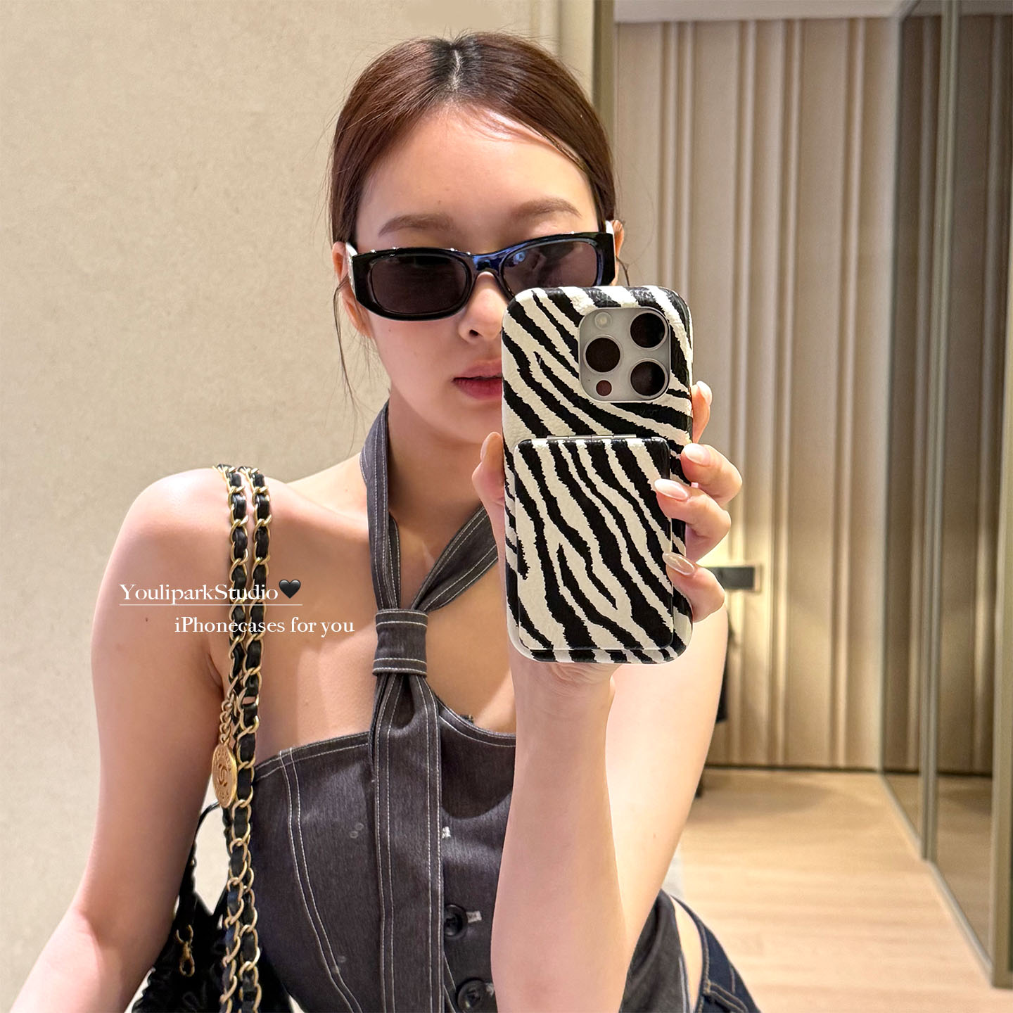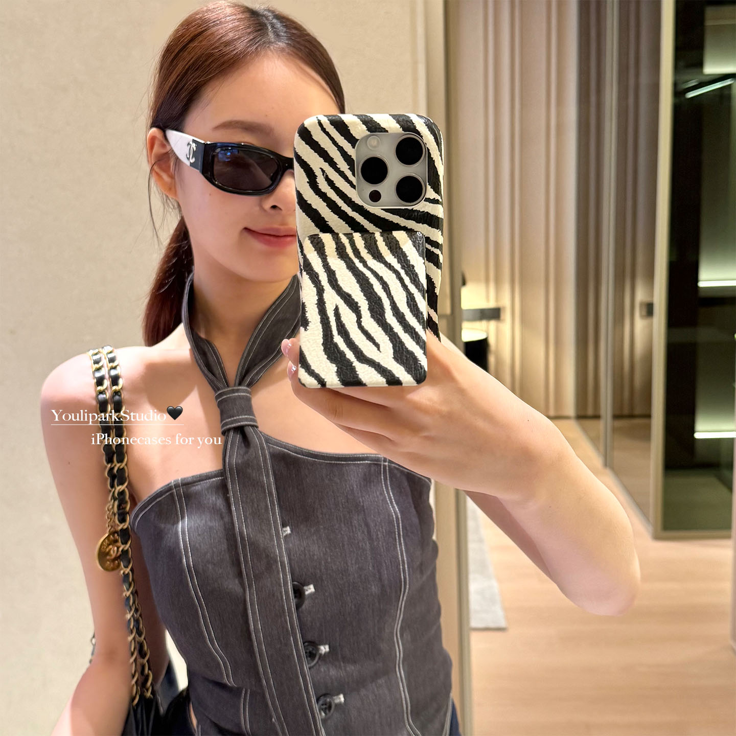 由里公园ins小众冷淡风皮质斑马纹镜面支架15适用17pro苹果17ProMax手机壳iPhone16全包17新款14Promax保护套