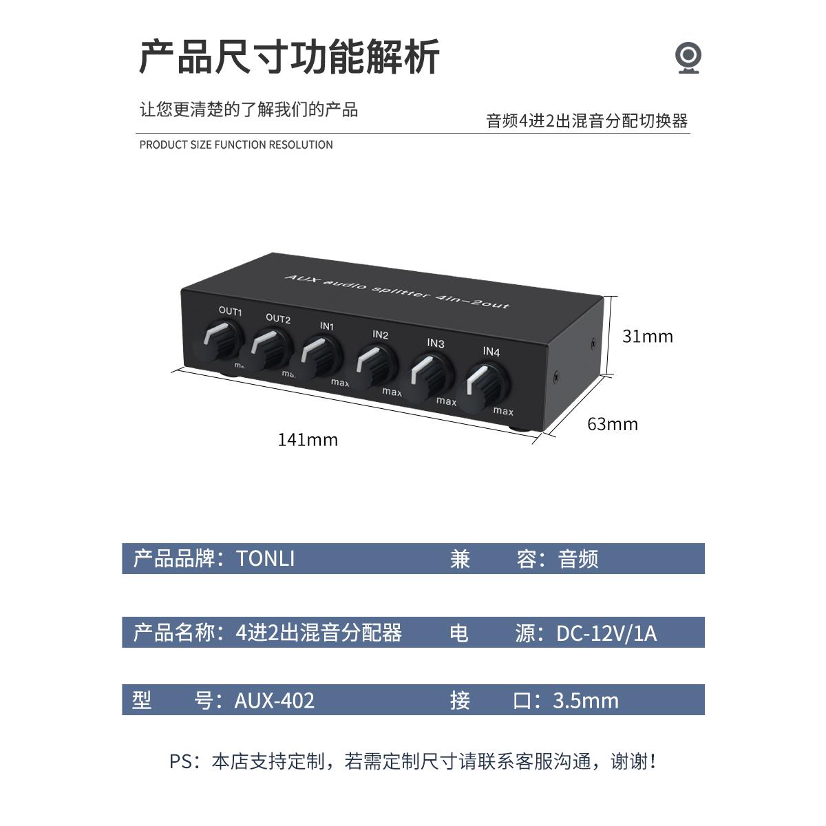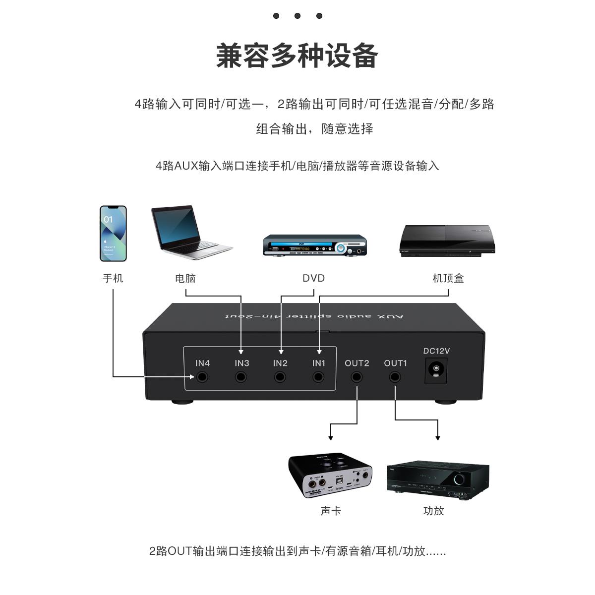 仝丽 立体声混音4进2出音频分配器 3.5AUX免切换 带运放 高保真