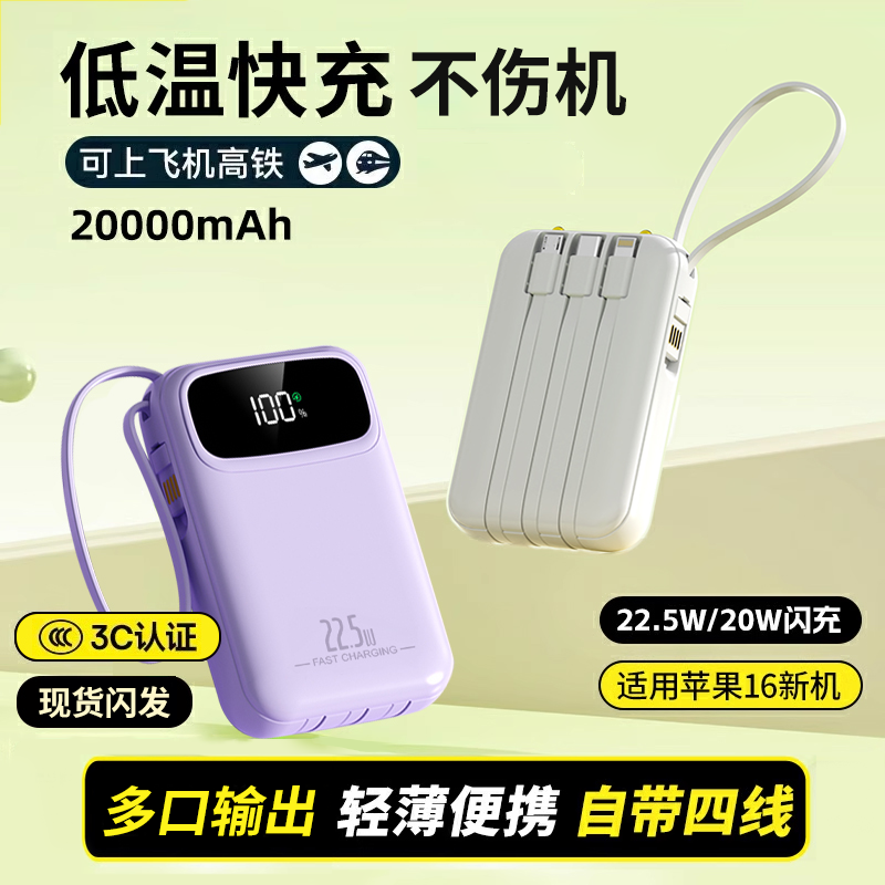 【充电宝3C认证】品胜20000毫安充电宝自带四线大容量超薄小巧便携政府补贴移动电源适用苹果17华为可上飞机