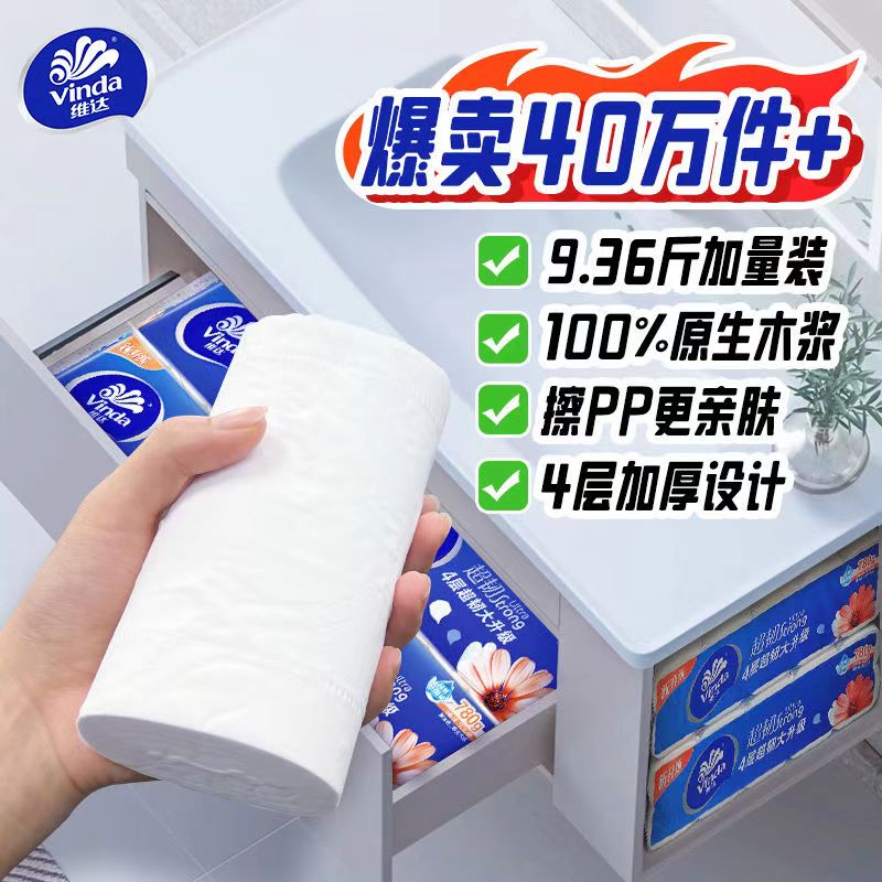 维达无芯卷纸4层780克加厚家用/原生木浆纸浆实惠批发立体美棉韧