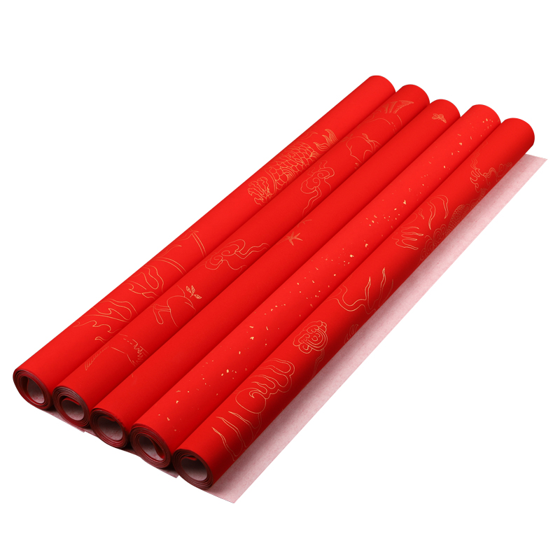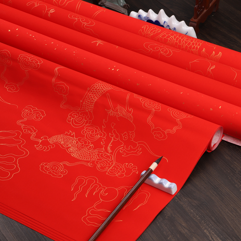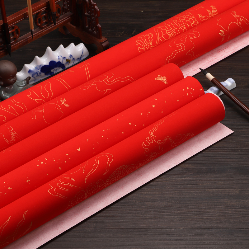 三味斋安徽泾县宣纸四尺六尺万年红素面/洒金描金龙凤仙鹤梅兰竹菊等半生半熟毛笔书法练习用纸剪纸大红结婚