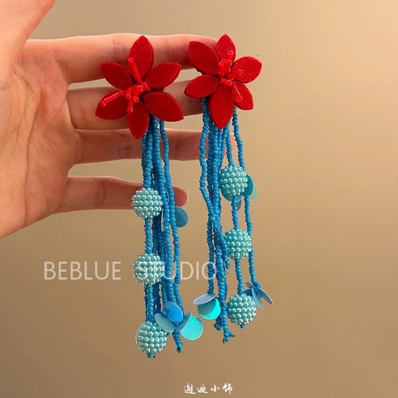 玫瑰冰茶~蓝色流苏花朵耳钉女高级感度假风小众耳环绝美耳饰耳夹