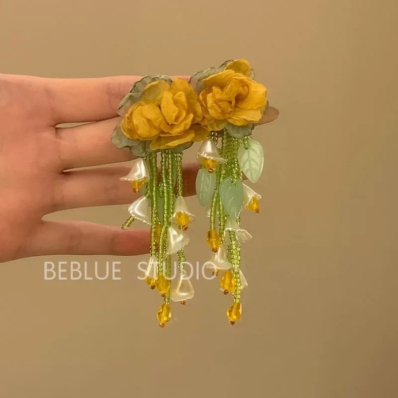 耳夹夜息花语撞色花朵串珠流苏耳环女耳钉度假风民族风耳饰多巴胺
