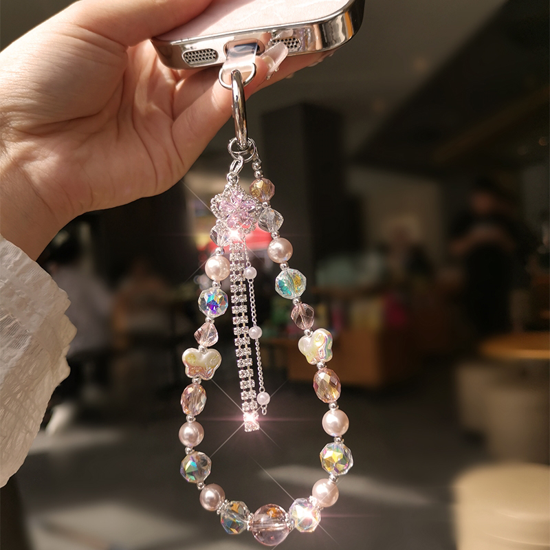 水晶花流苏蝴蝶珍珠手机链适用全型号手机挂绳精致轻奢高级小众挂件手腕短款户外旅游行防丢防摔手机挂链新款