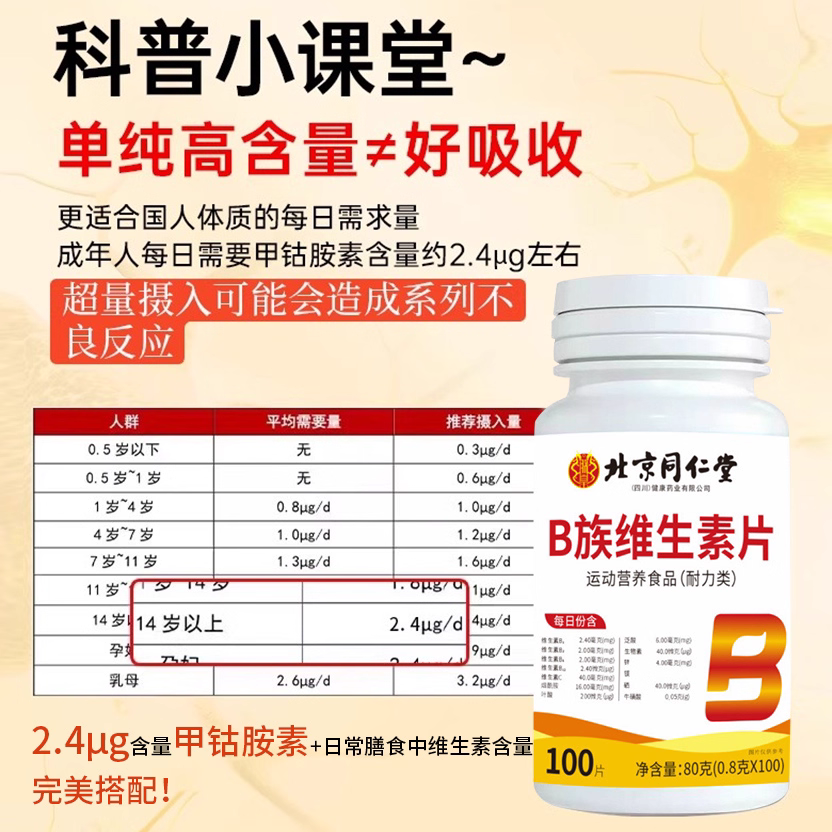 北京同仁堂维生素B12B族营养甲钴胺修复神经100片正品官方旗舰店