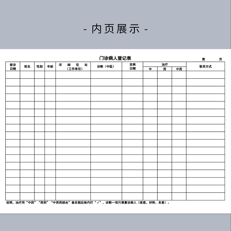门诊病人登记薄医疗机构就诊病人门诊登记簿空腔药店医院病历病情说明病人记录本村卫生室日志急诊出诊登记本