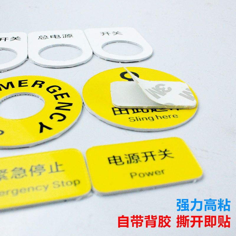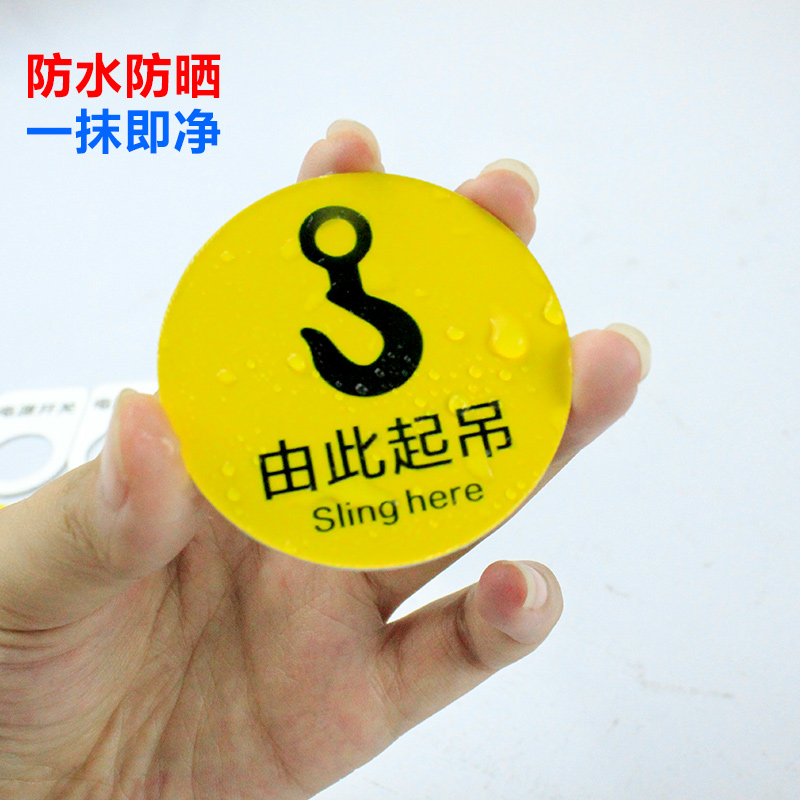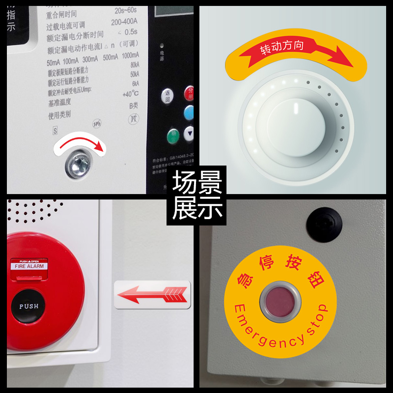 机械设备安全警示贴急停按钮紧急停止PVC标贴胶片转动方向由此吊起电源开关作业施工启动提示告示标示标志