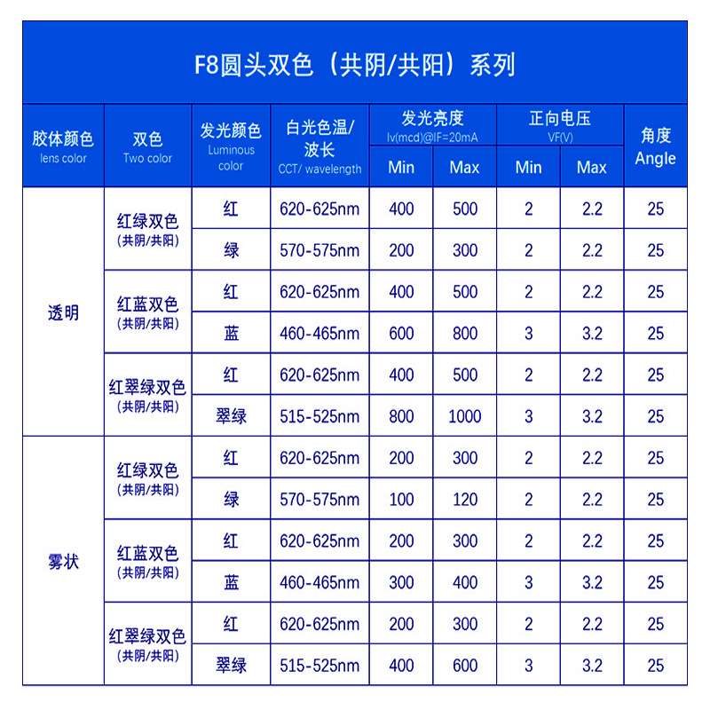 8mm圆头双色透明雾状红普绿红蓝翠绿发光二极管f8灯珠led共阴共阳