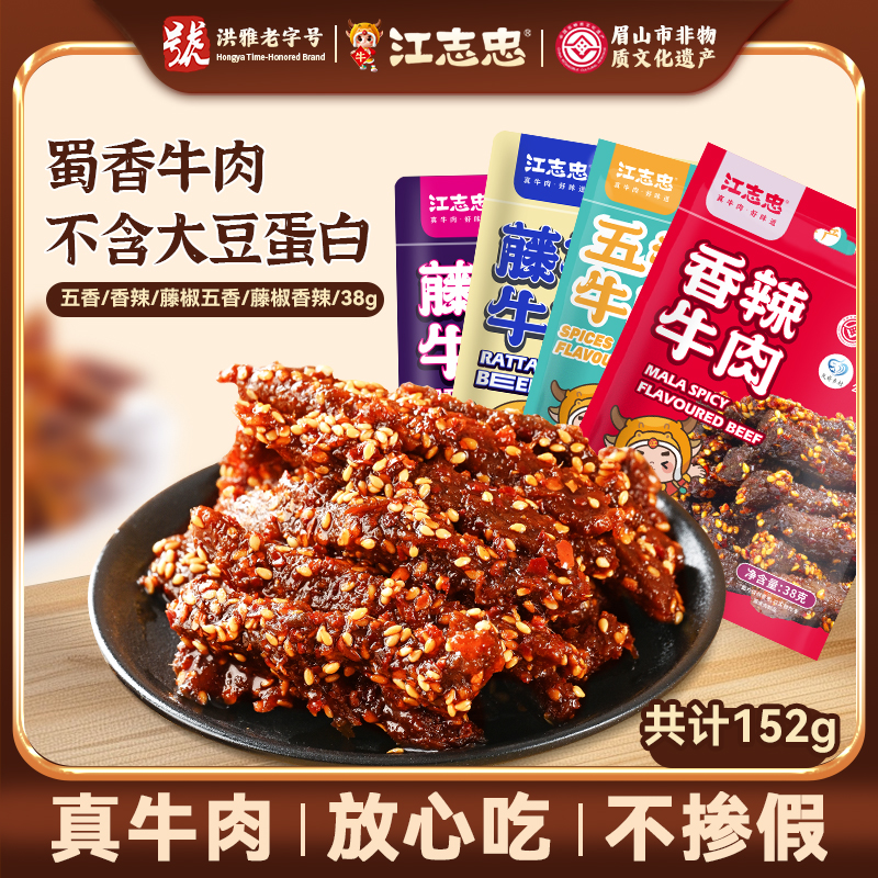 【江志忠牛肉干】38g*4袋独立包装麻辣五香藤椒多口味开袋即食