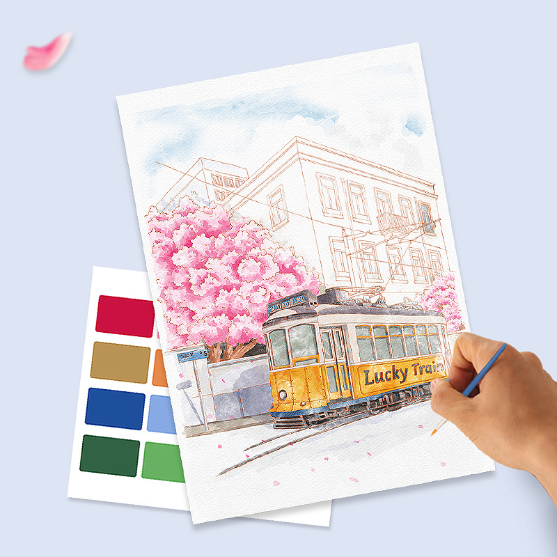创意水彩画涂色线稿diy填色卡成人解压线条画风景女孩自带颜料笔
